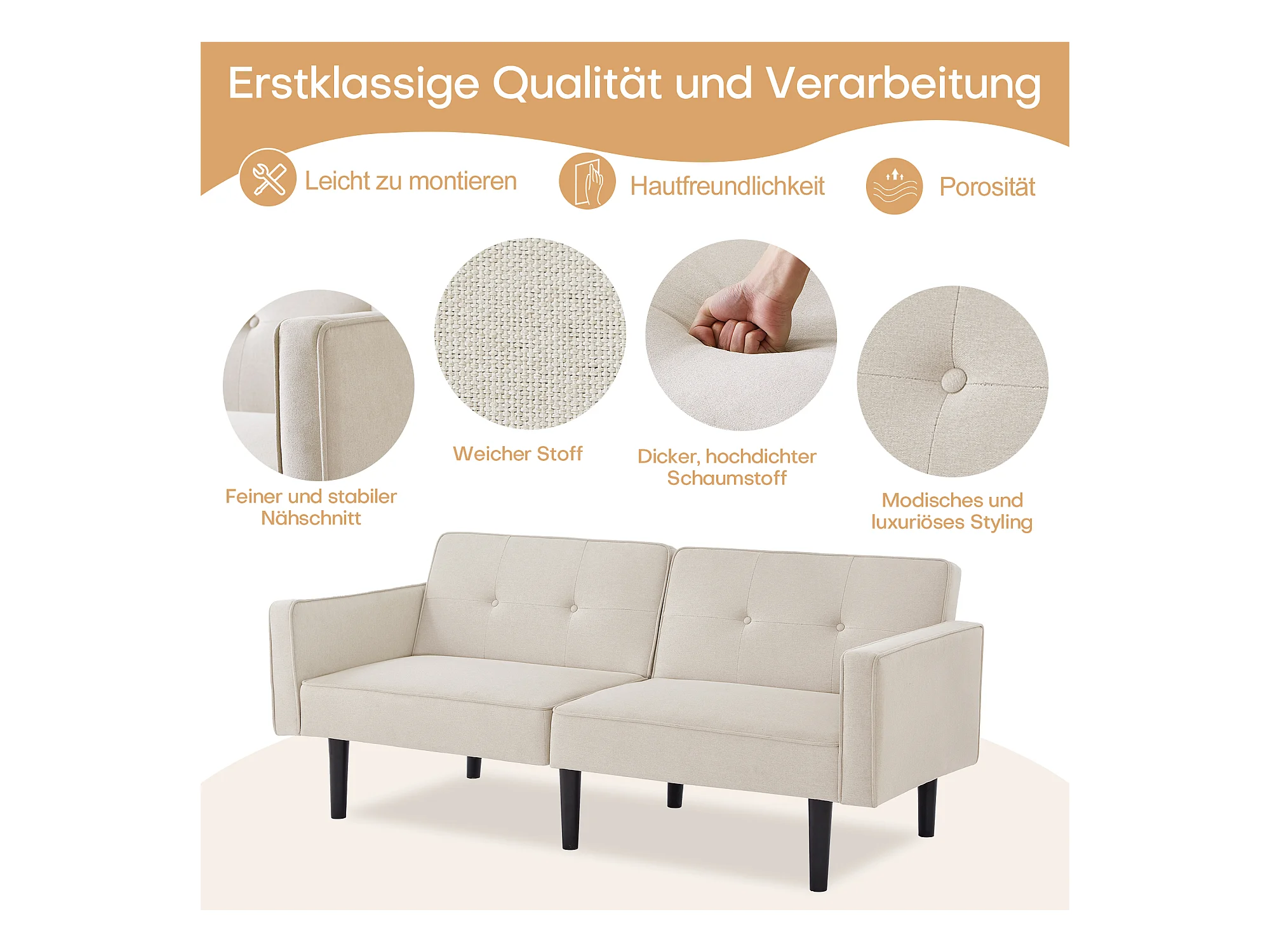 Canapé 2 places avec dossiers réglables - 176 x 76 x 74 cm - Tissu coton-lin et pièds en métal - Beige