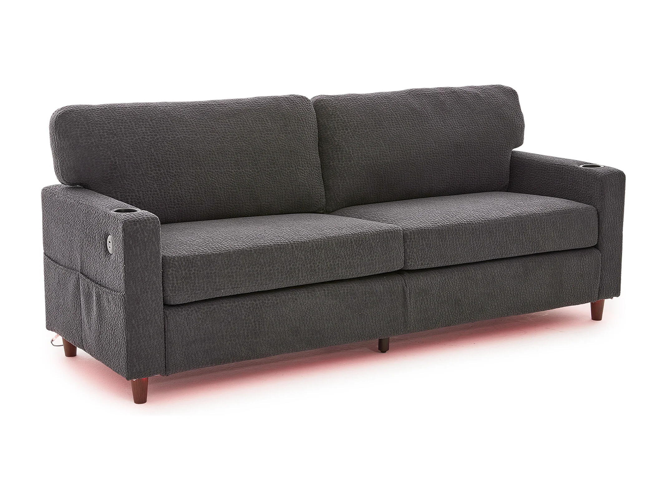 Canapé 2 places avec port USB-C, LED et poches latérales - Tissu chenille - Gris foncé