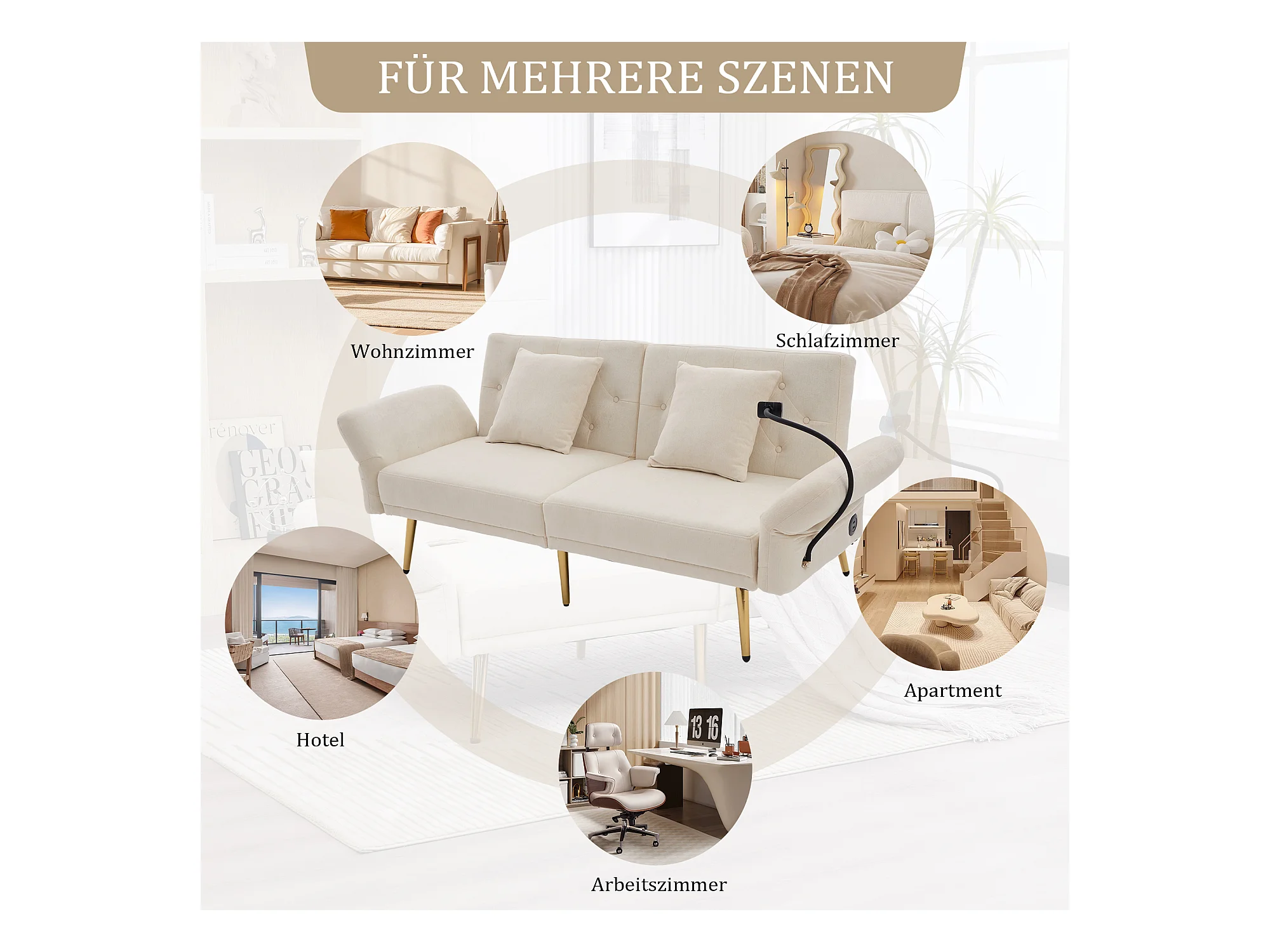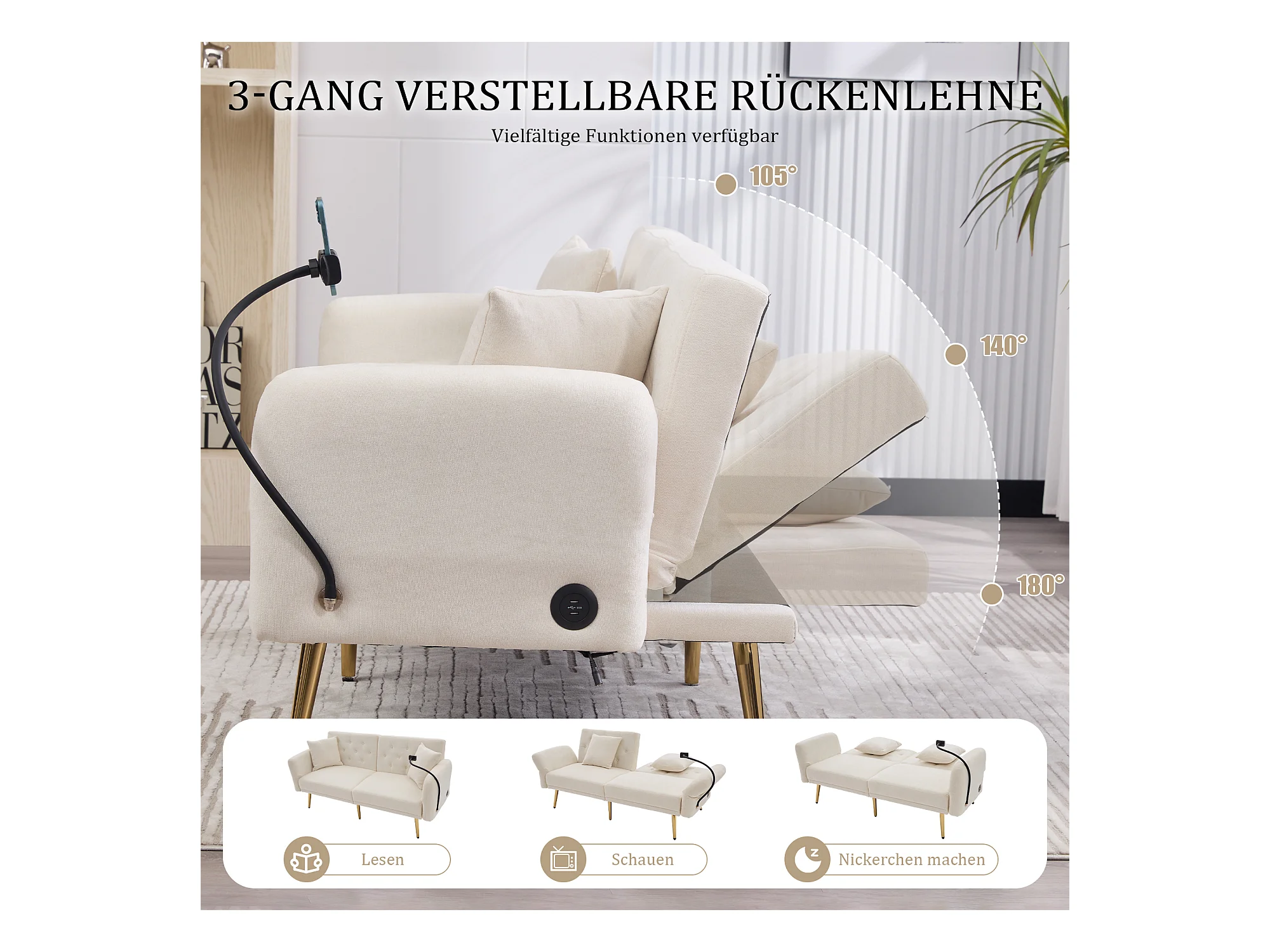 Canapé 2 places convertible avec dossier réglable + 2 USB + poche latérale - 173 x 78 x 78 - velours - beige
