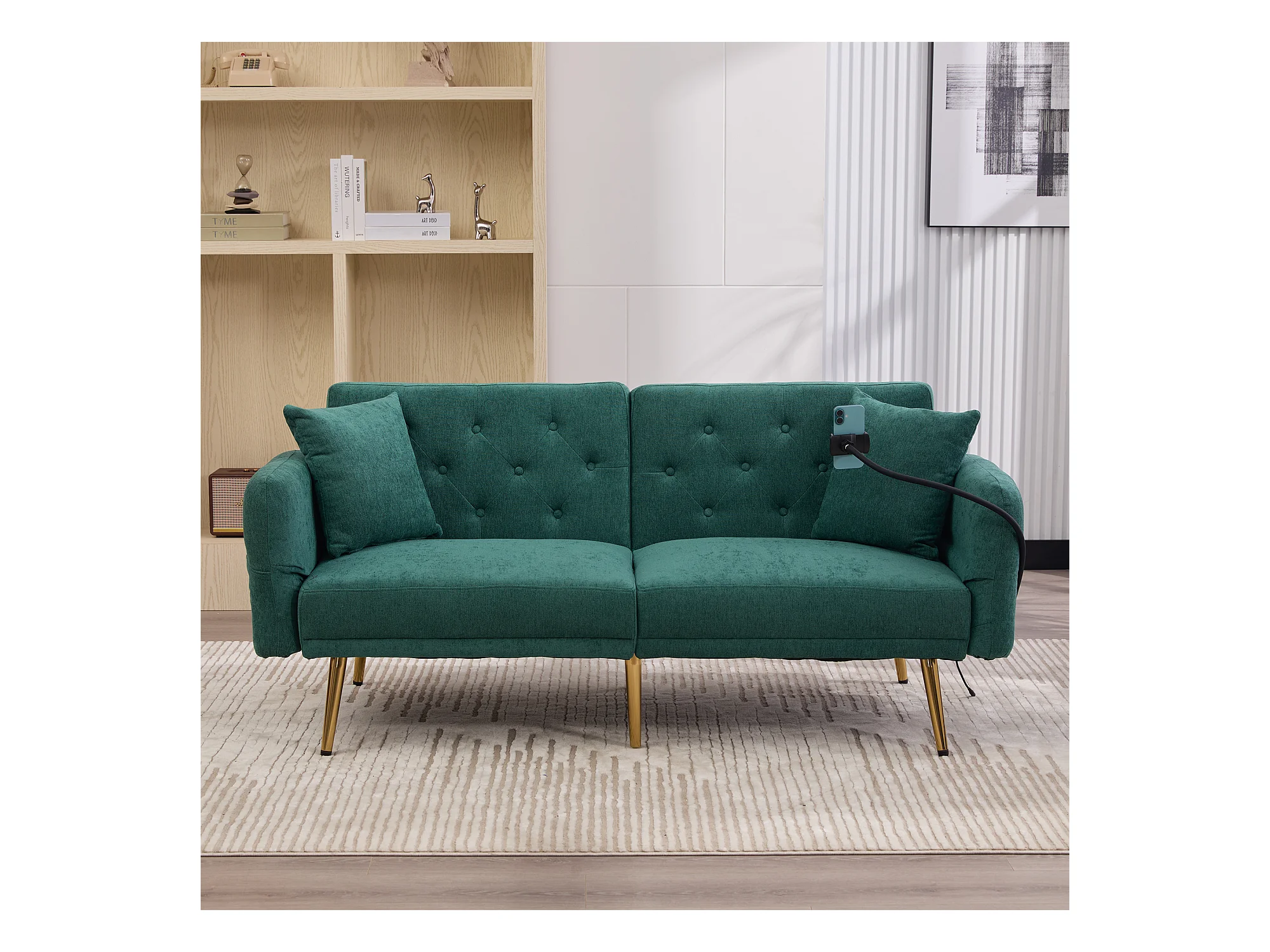 Canapé 2 places convertible avec dossier réglable + 2 USB + poche latérale - 173 x 78 x 78 - velours - vert