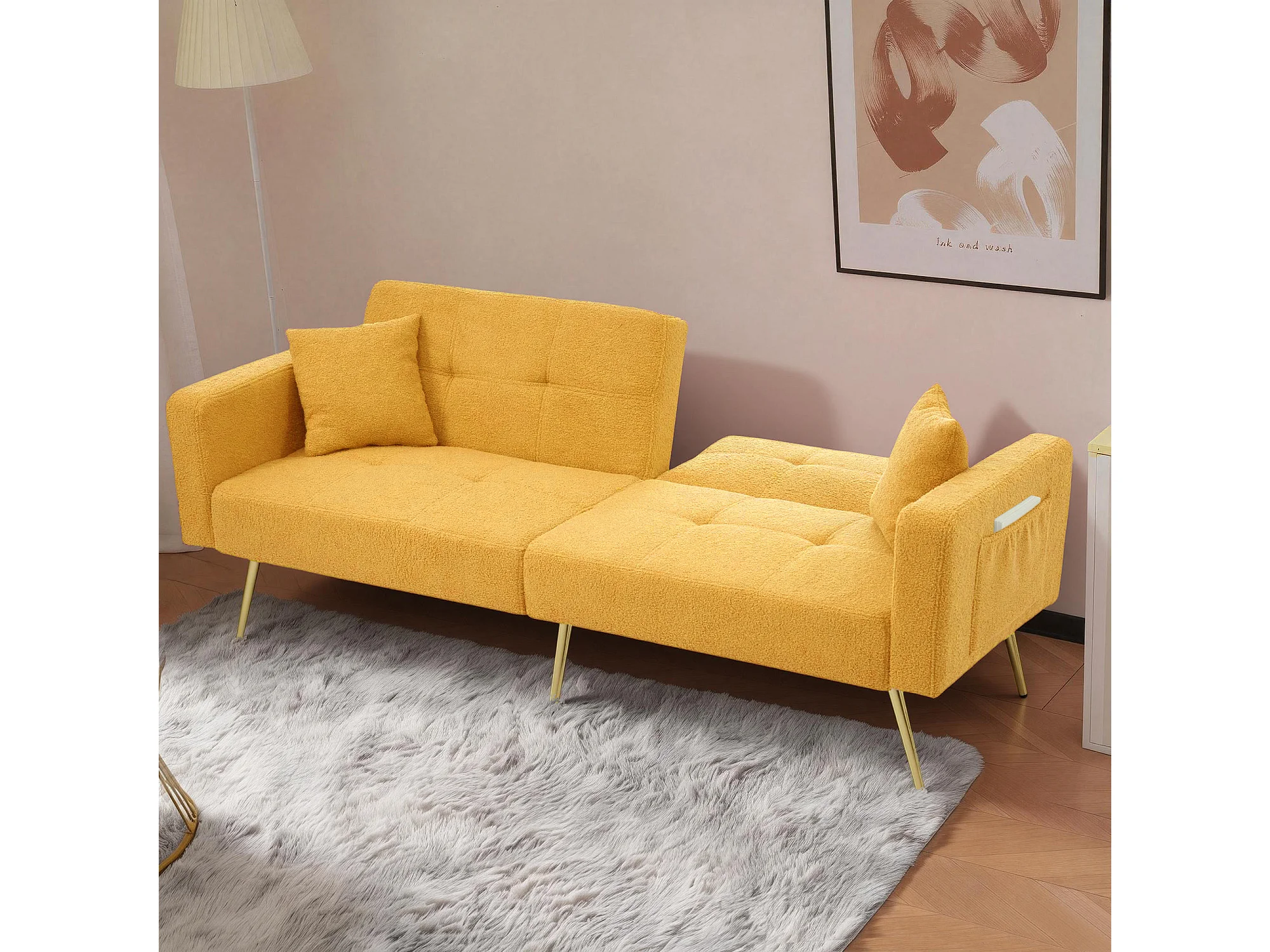 Canapé 2 places convertible clic-clac en tissu Sherpa - 175 x 64 x 72 cm - Pieds dorés - Jaune
