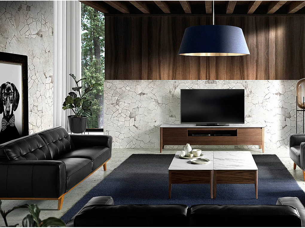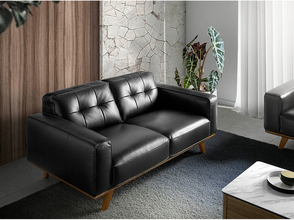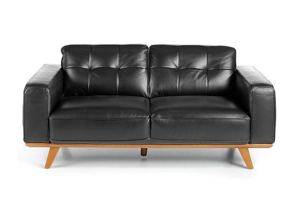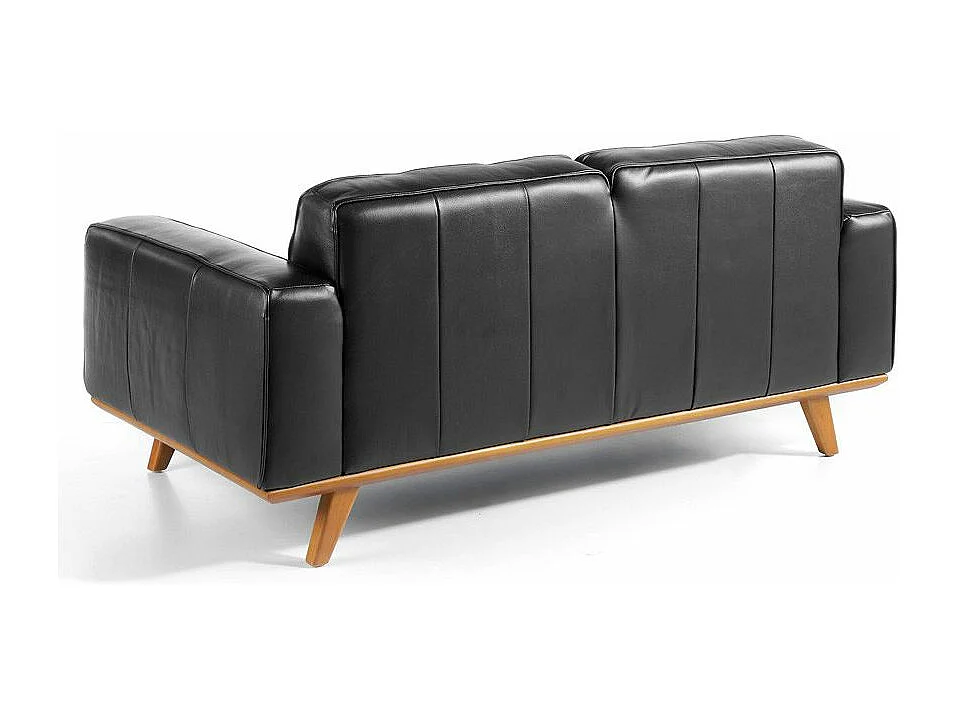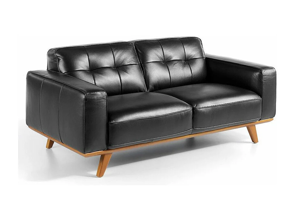 Canapé 2 places cuir noir matelassé et pieds bois massif Kiro