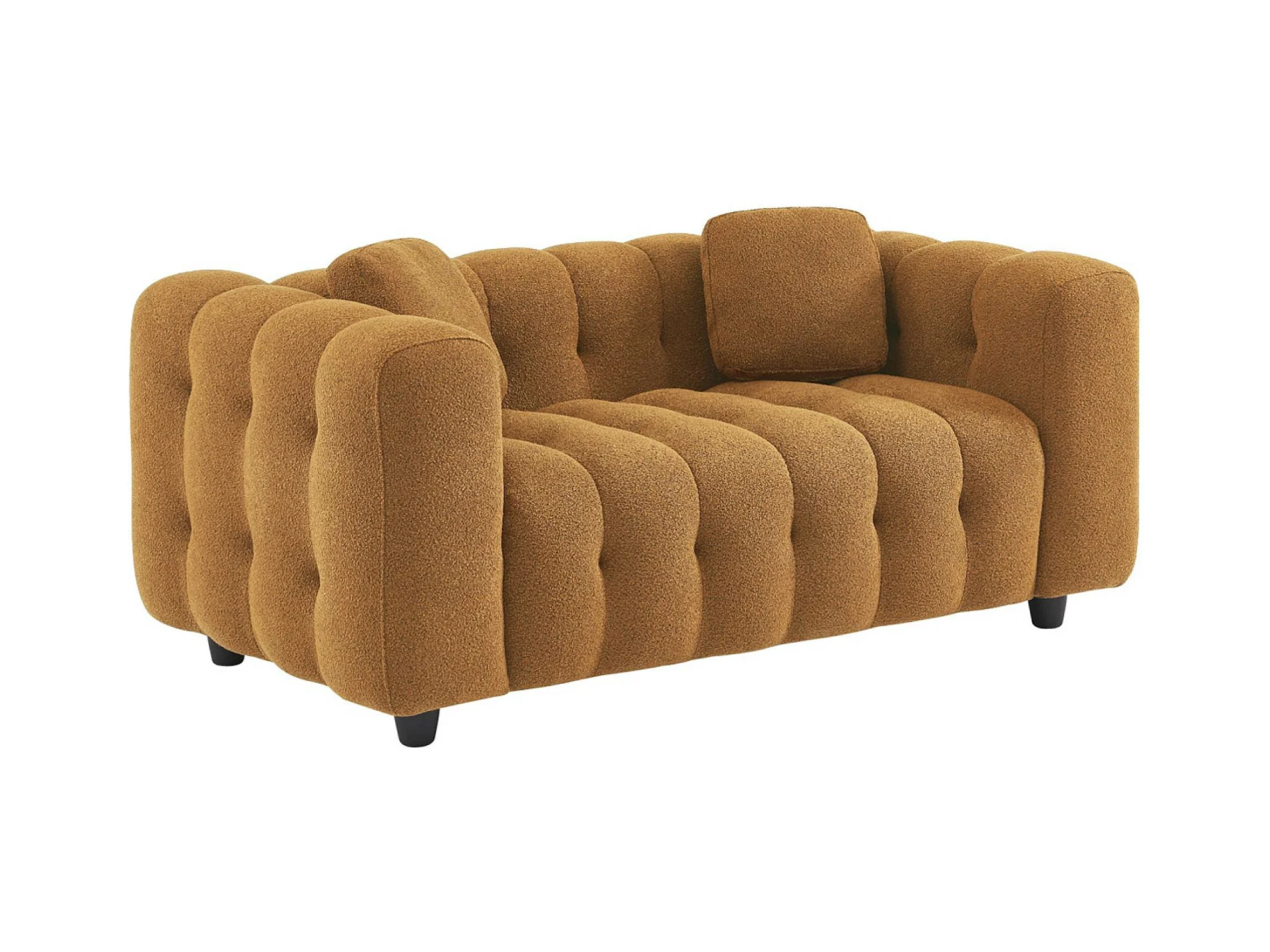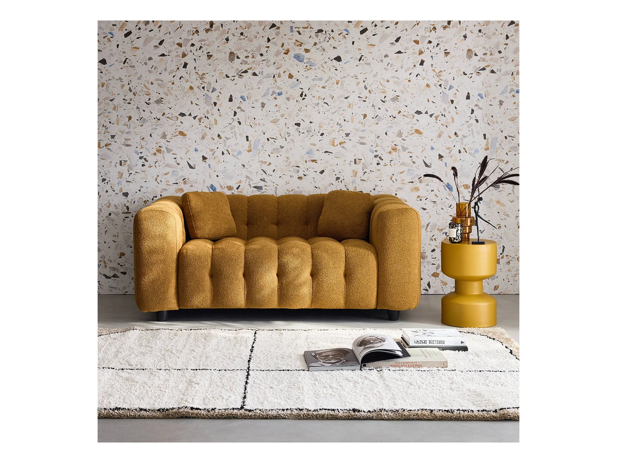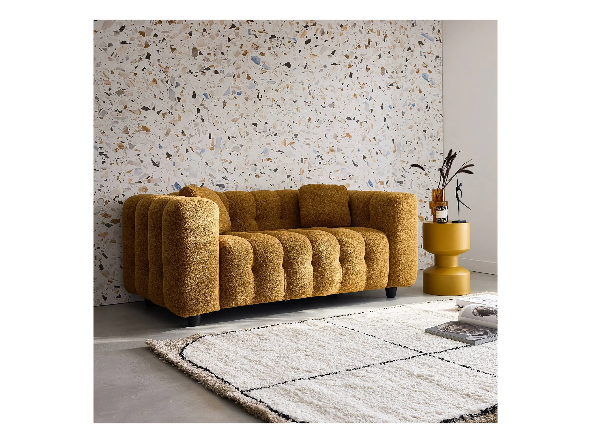Canapé 2 places en bouclette texturée capitonné. moutarde. structure bois d'eucalyptus et contreplaqué