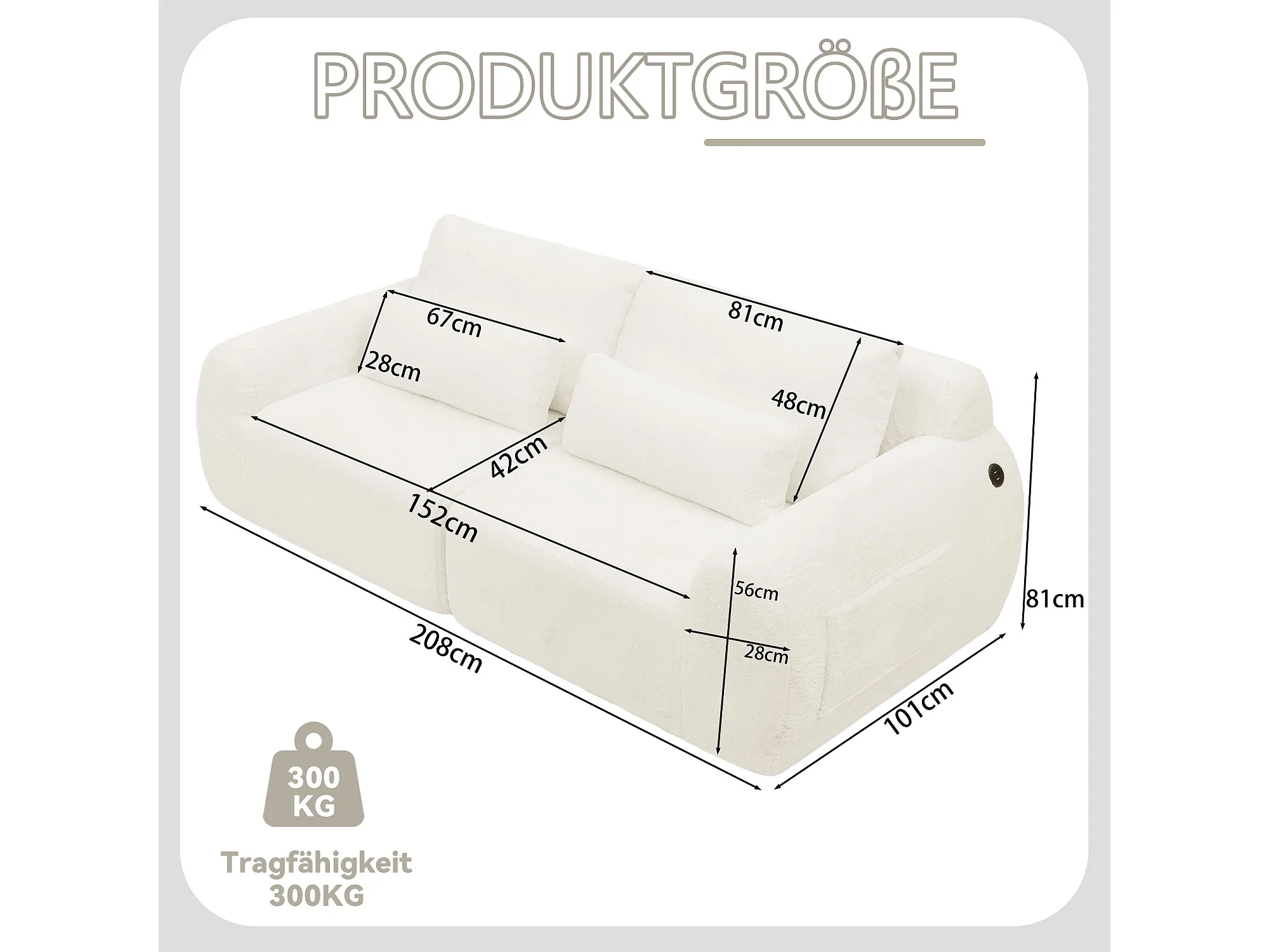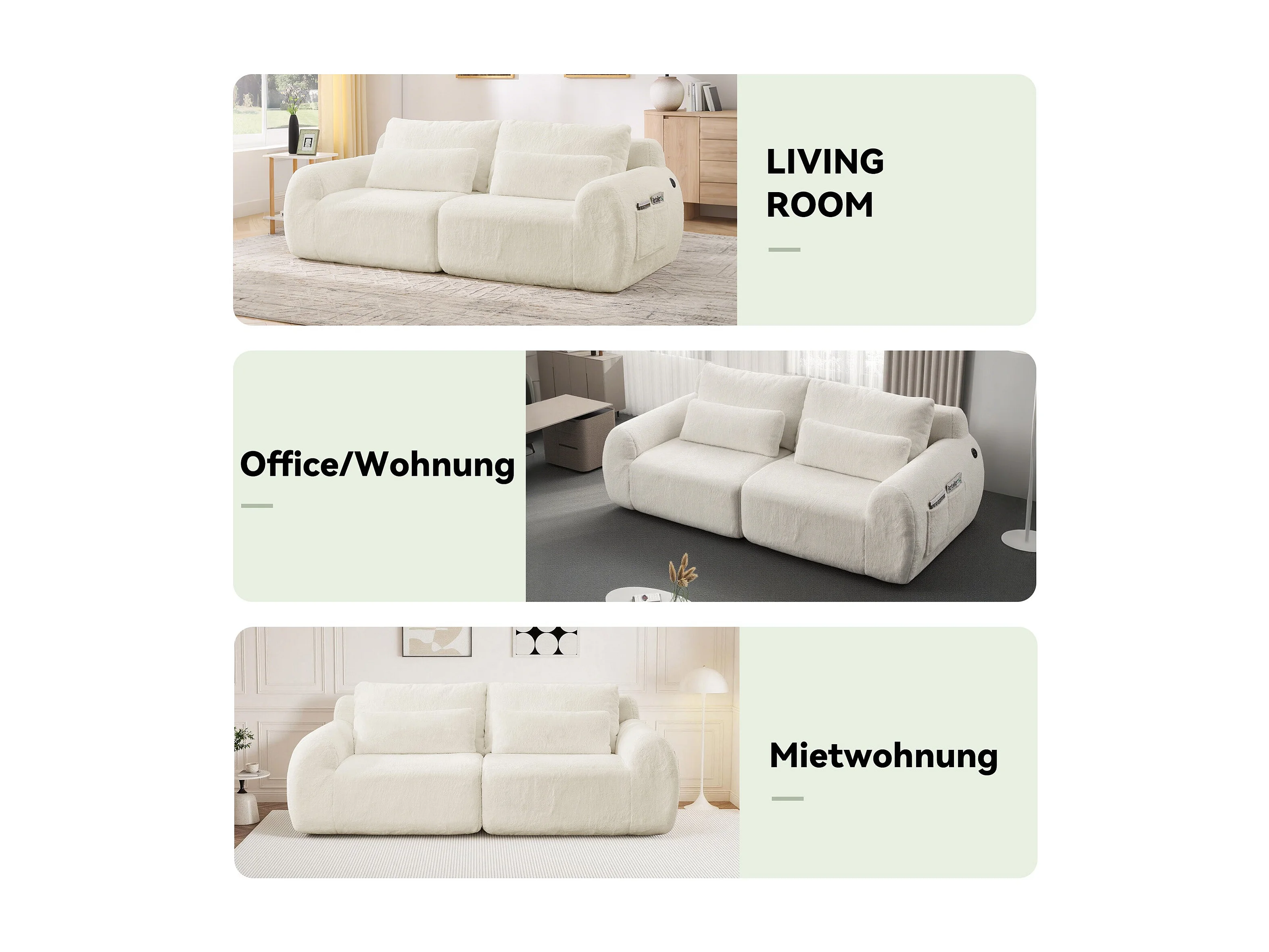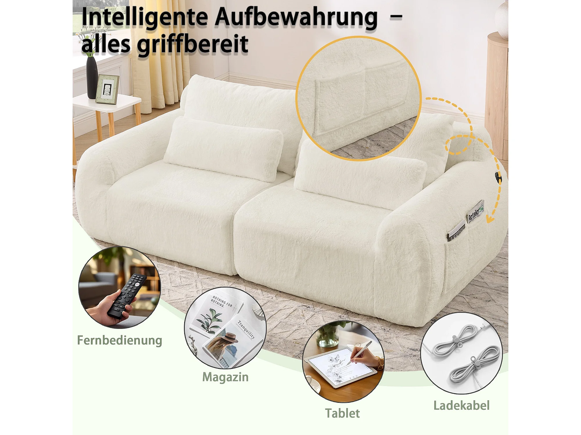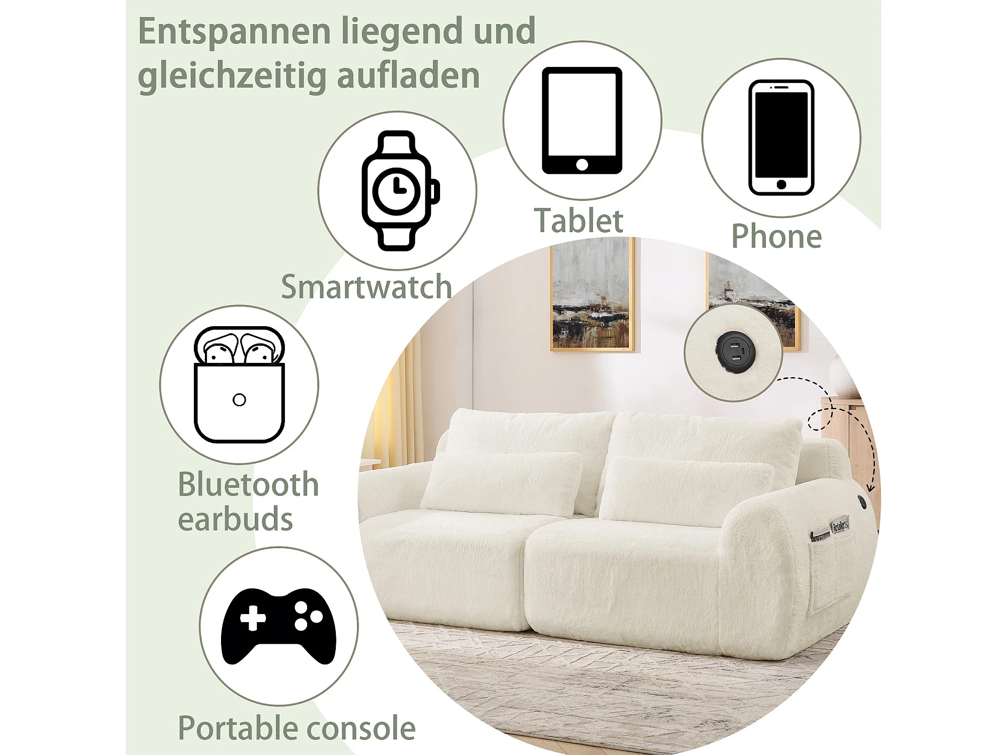 Canapé 2 places en fausse fourrure de lapin, beige, USB, poche latérale
