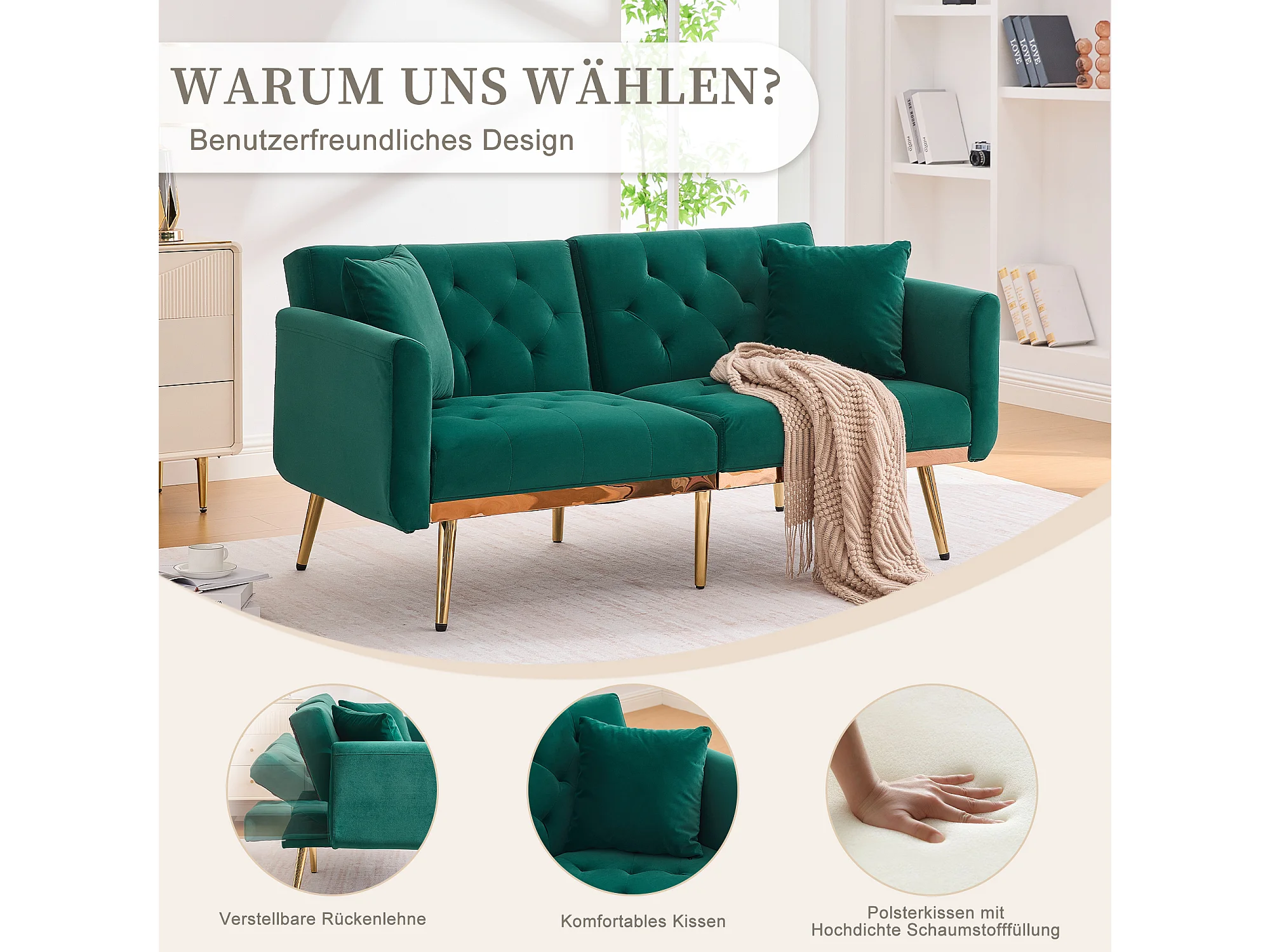 Canapé 2 Places en Tissu Velour vert - avec dossier réglable et pieds dorés - Élégant et pratique pour votre salon