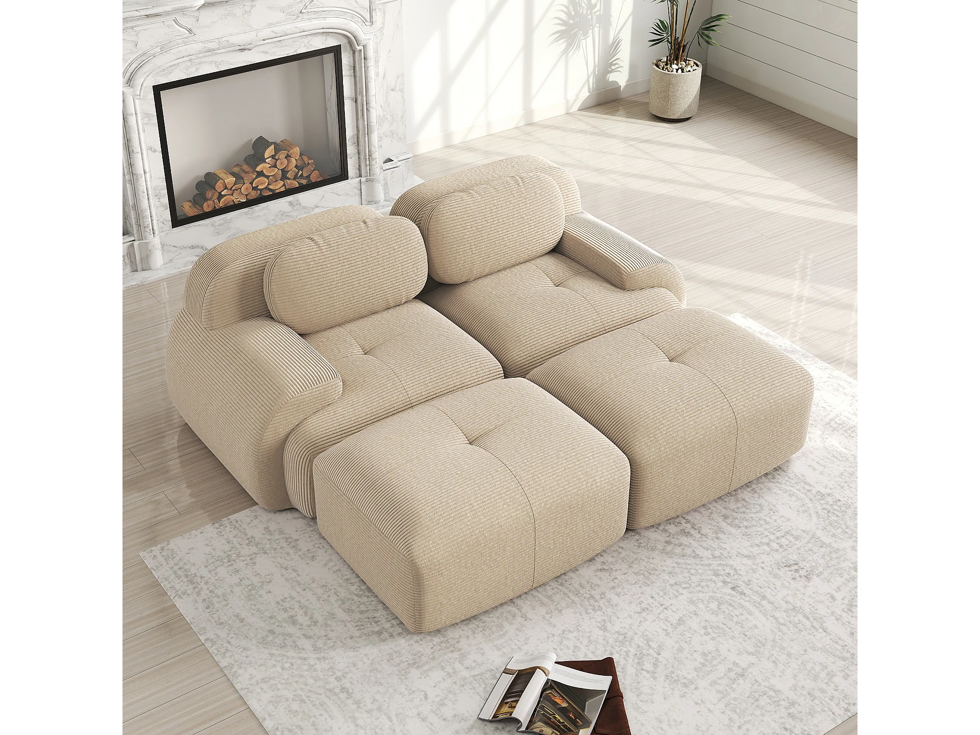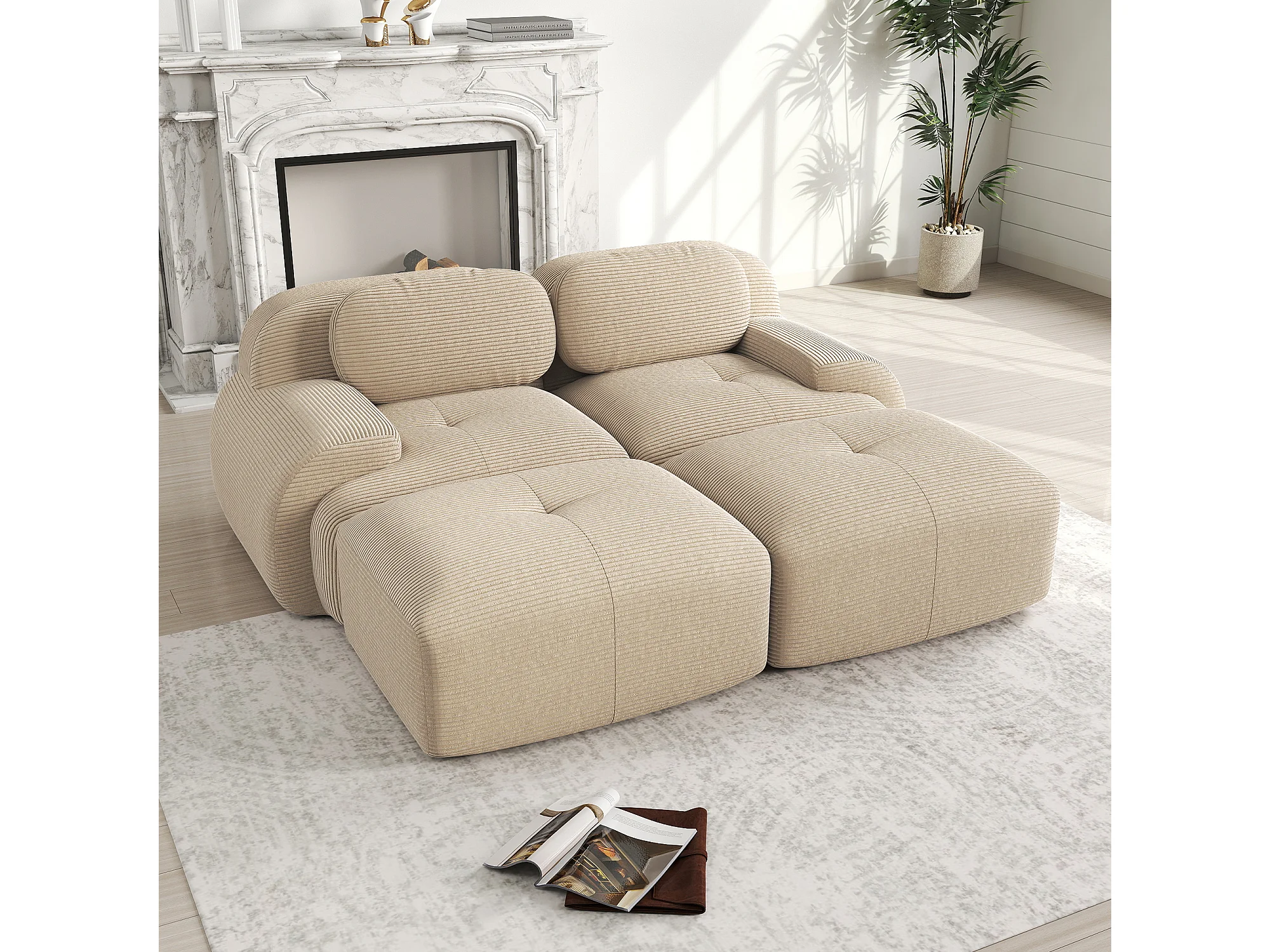 Canapé 2 places en velours côtelé avec accoudoirs et repose-pieds, beige - pour salon et chambre
