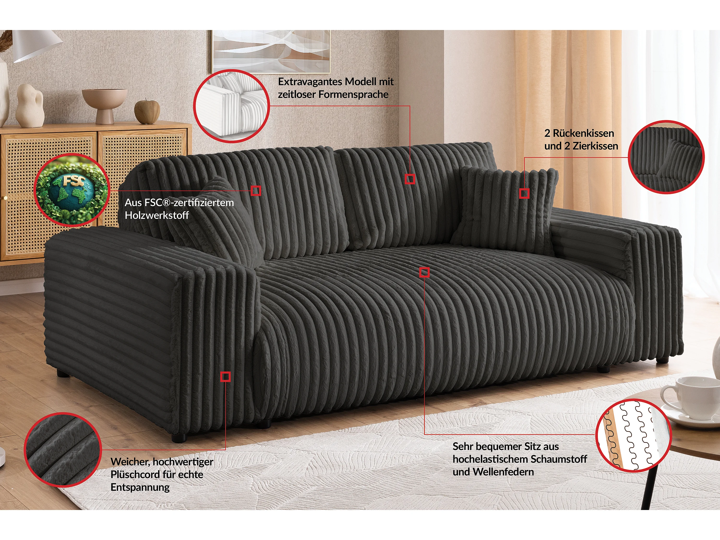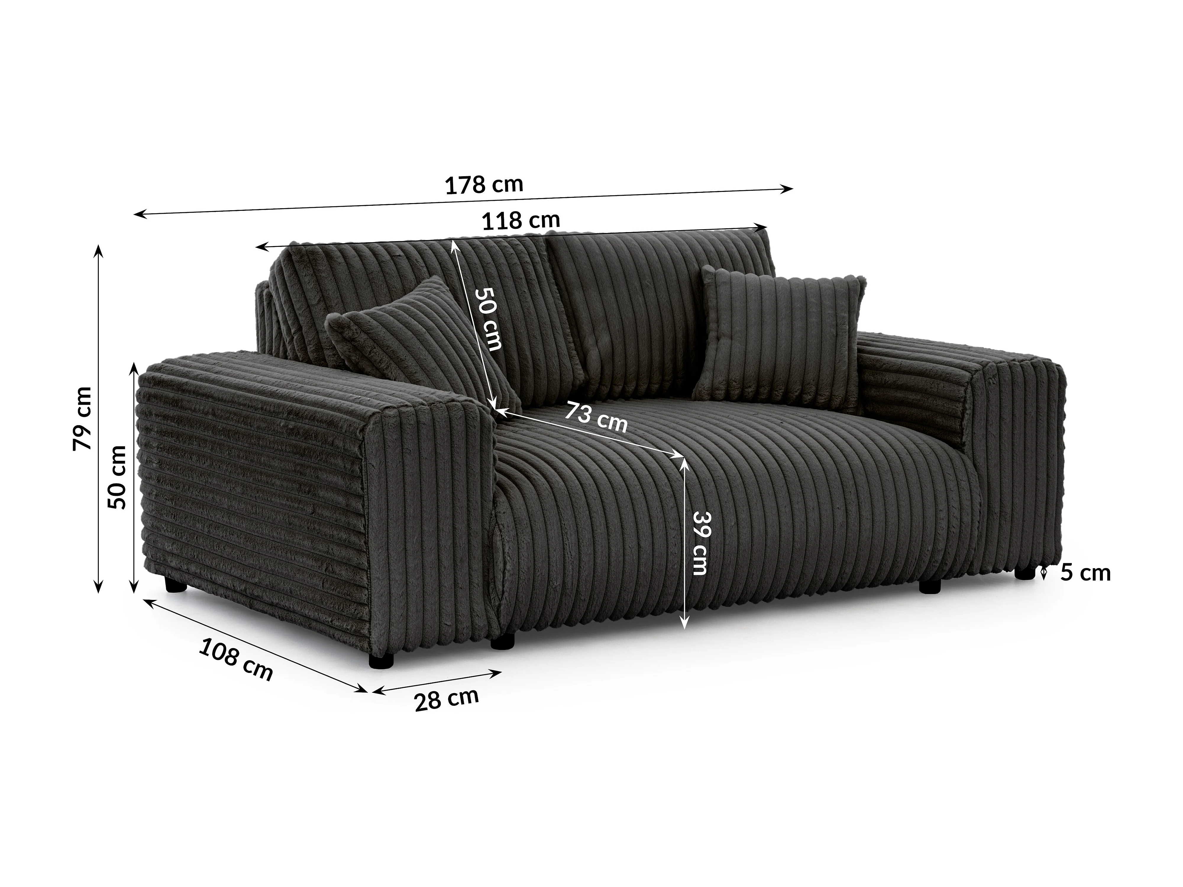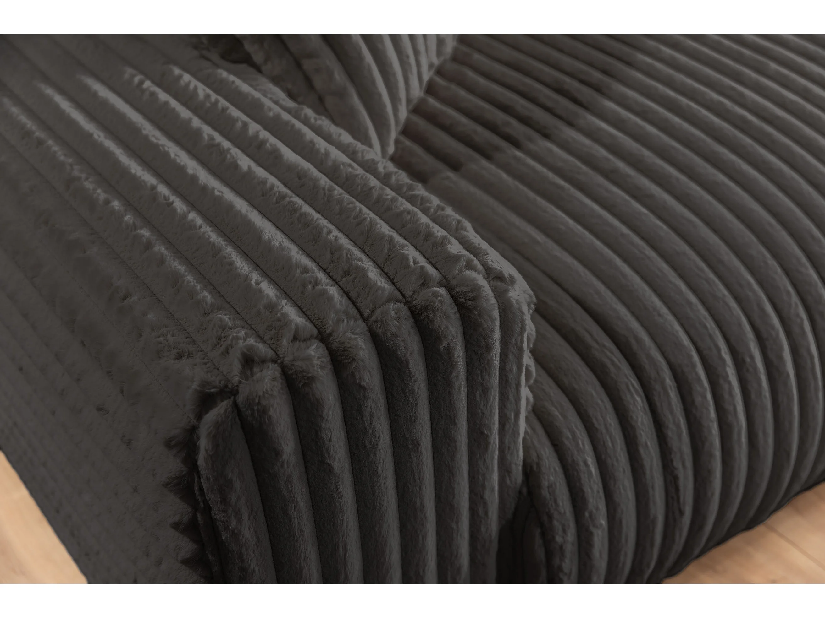 Canapé 2 places en velours côtelé pelucheux gris foncé offrant un agréable confort d’assise MOLLIS