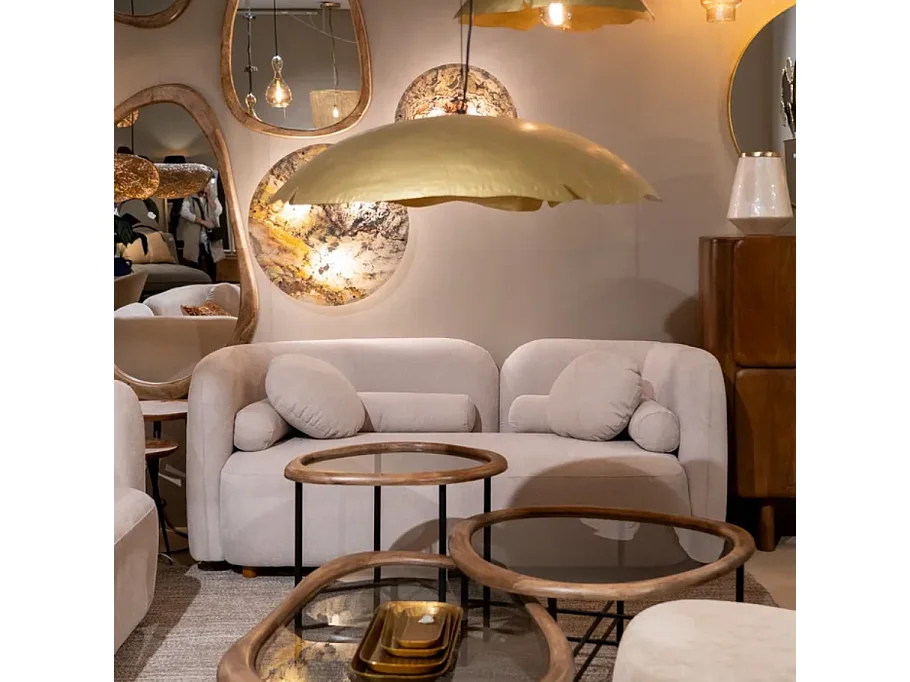 Canapé 2 places galbé en tissu beige avec coussins AURALINE