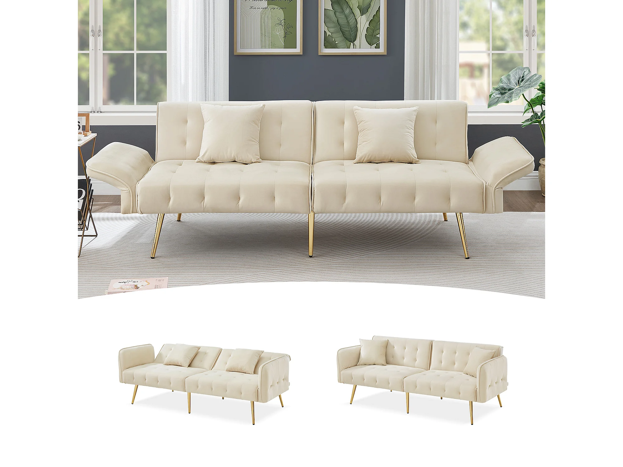 Canapé 2 places moderne, 178 x 82 x 70, clic clac, dossier et accoudoirs réglable, Velours Beige