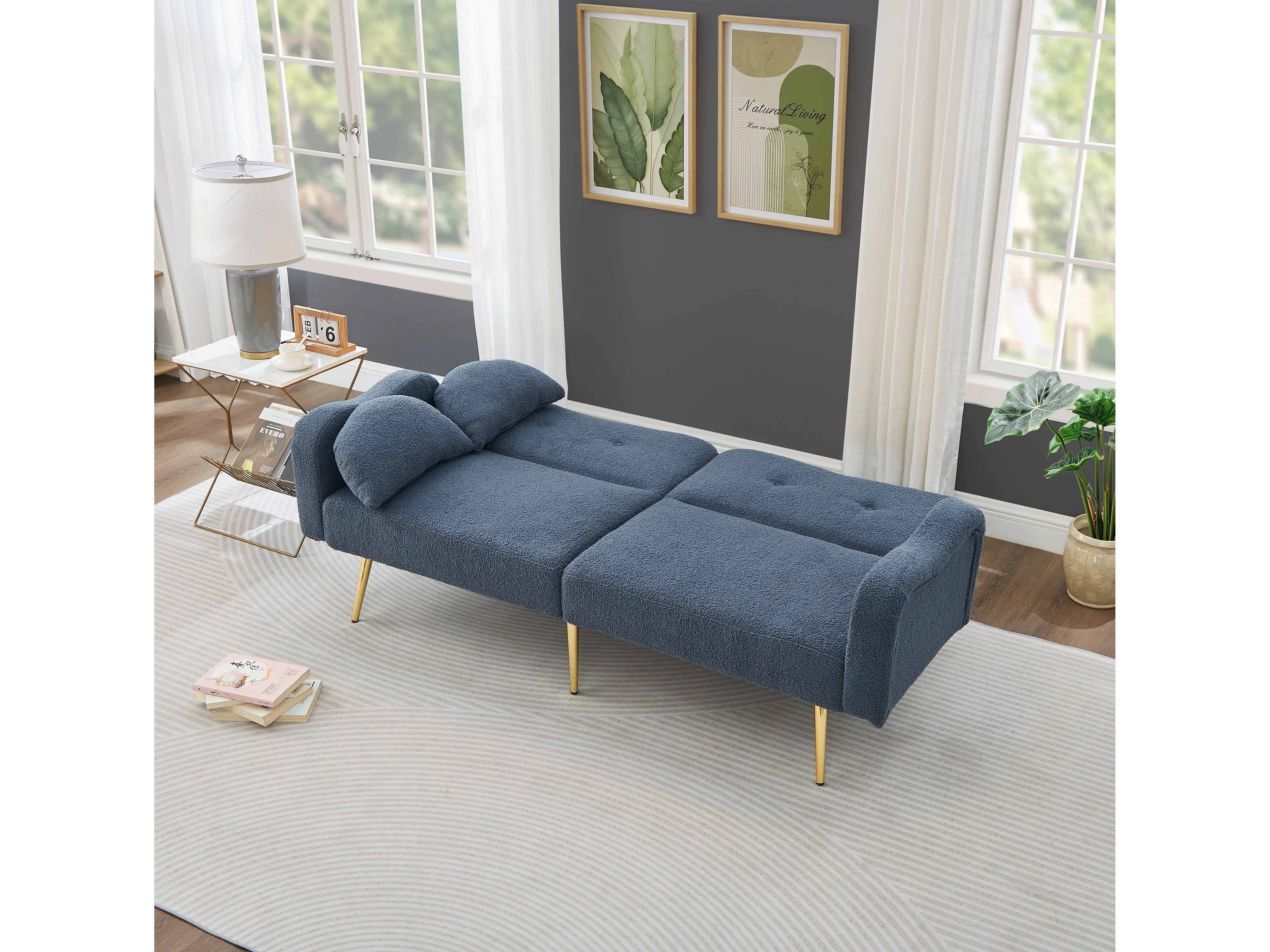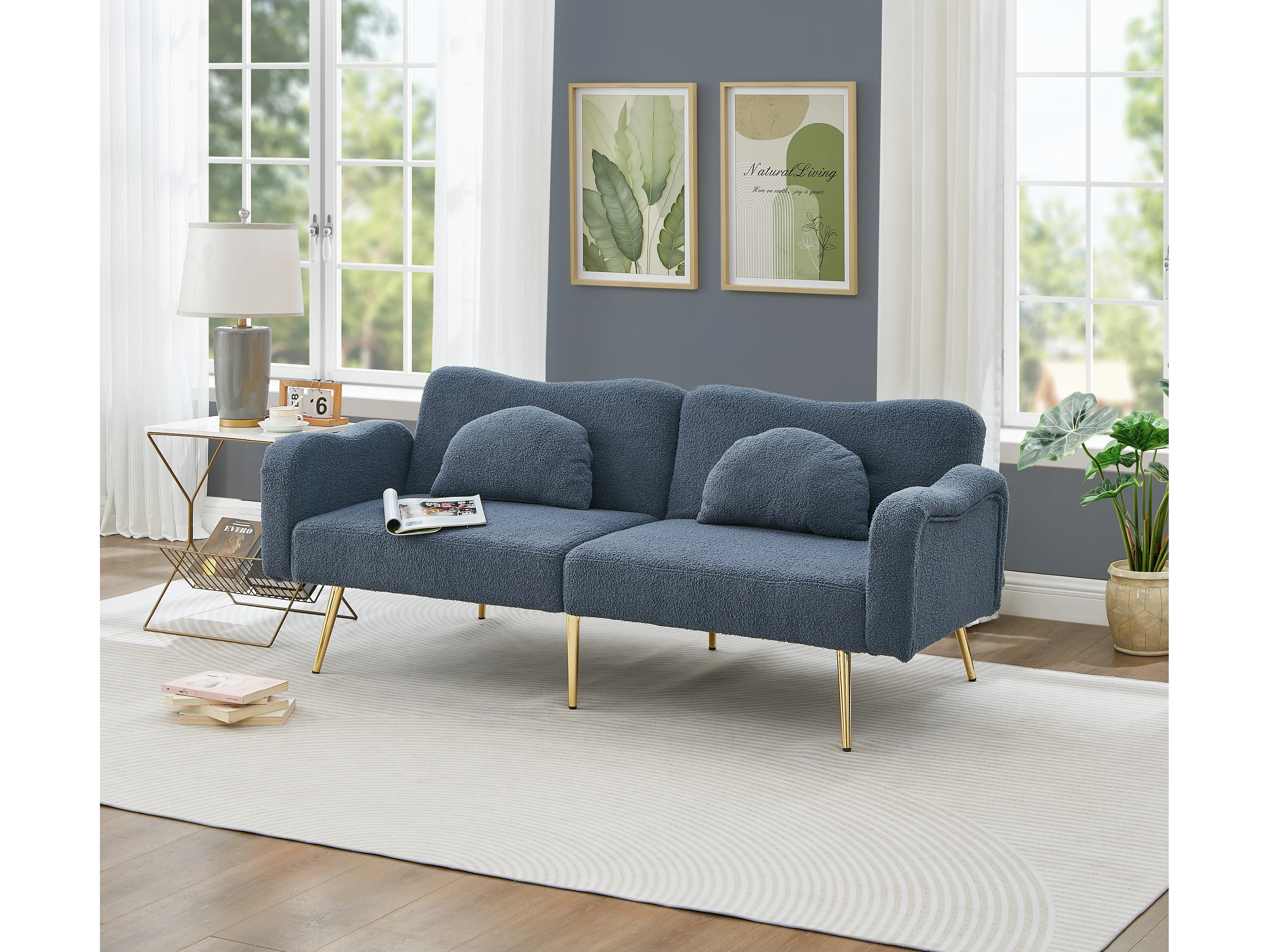 Canapé 2 places Moderne Accoudoirs en vagues Mécanisme inclinable Mousse Structure bois Pieds dorés Gris bleu (Sans matelas)