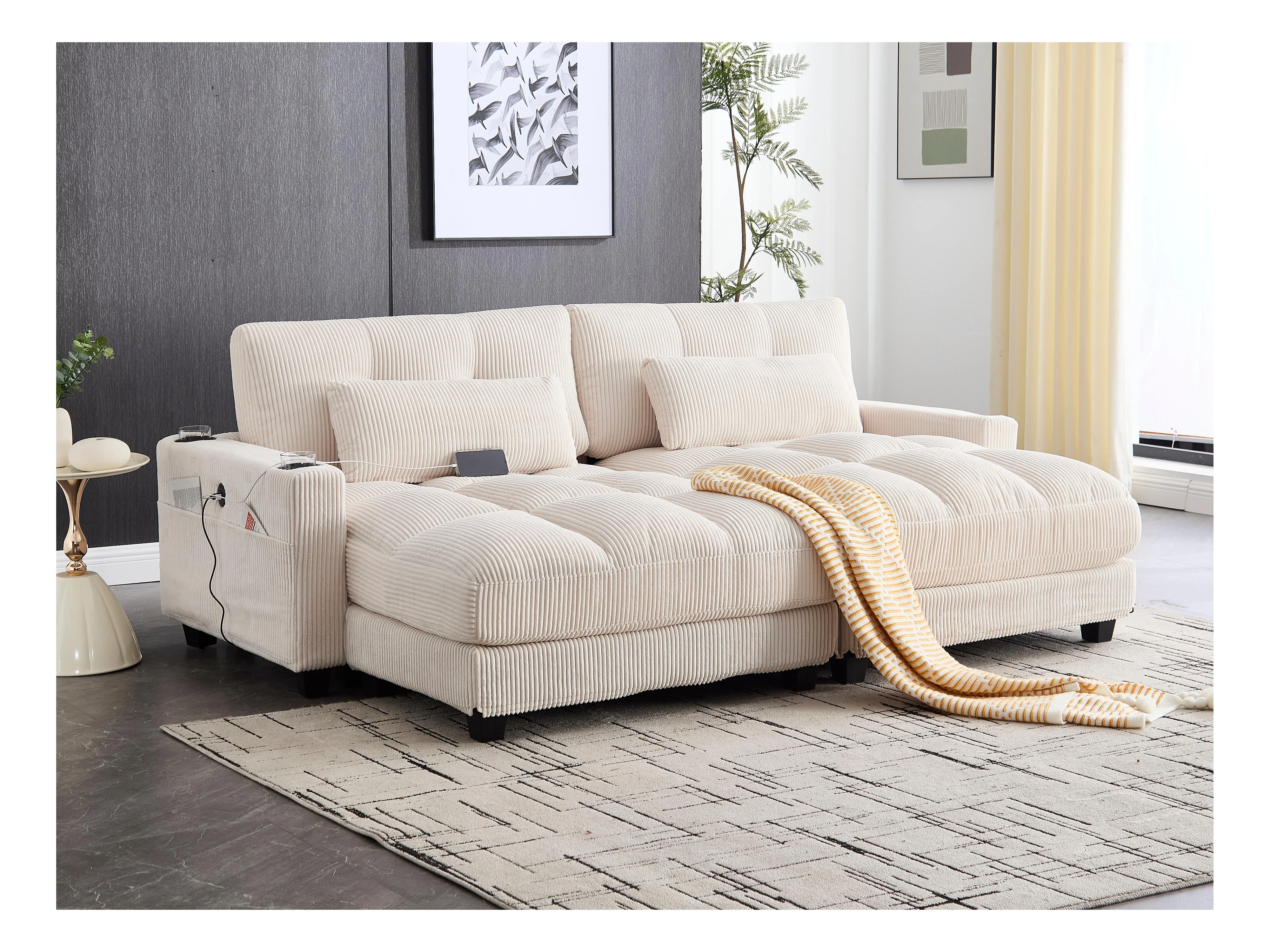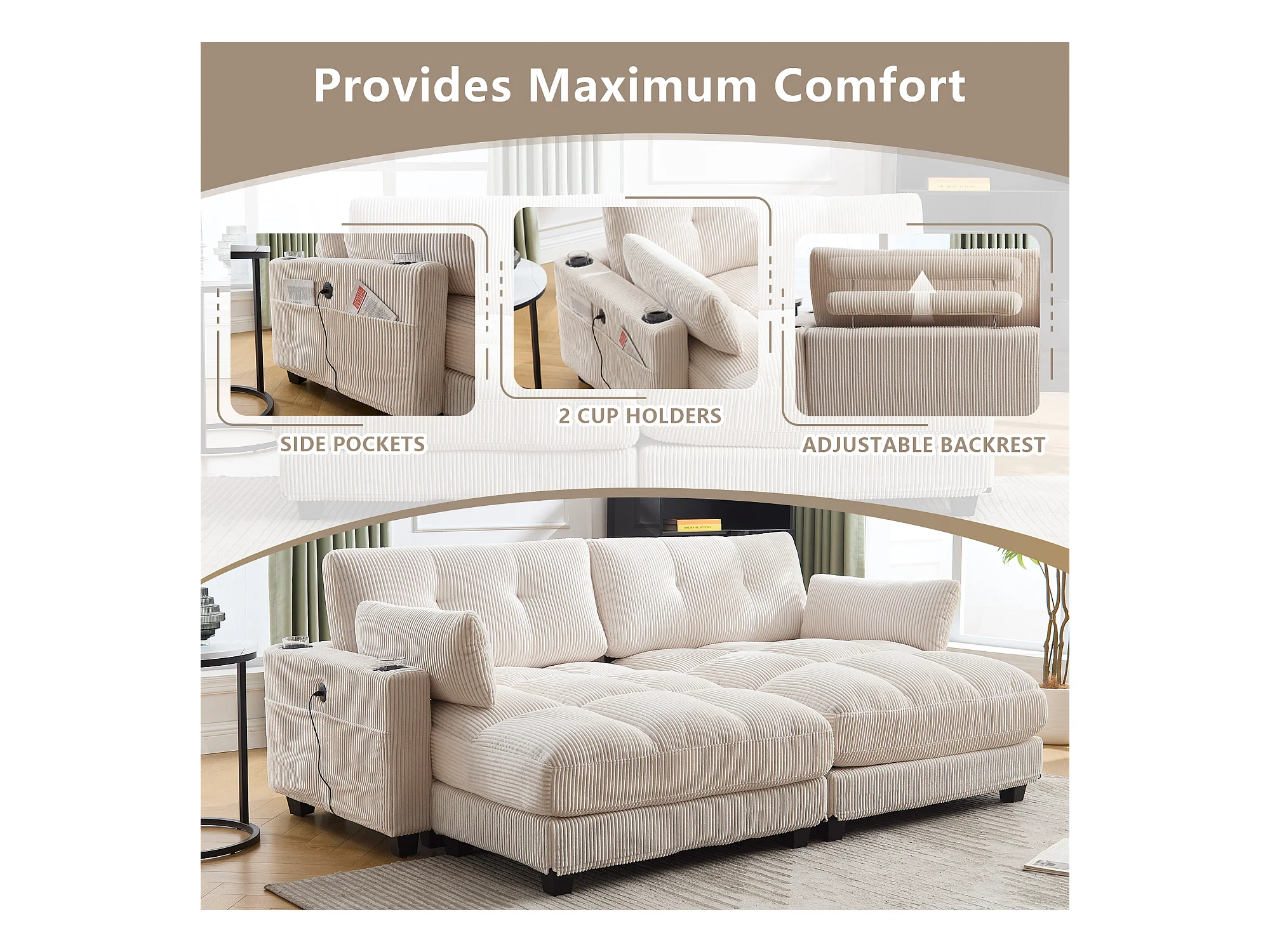 Canapé 2 places modulable en velours beige – avec USB et porte‑gobelet – multifonction pour petit espace - 112x140x81cm