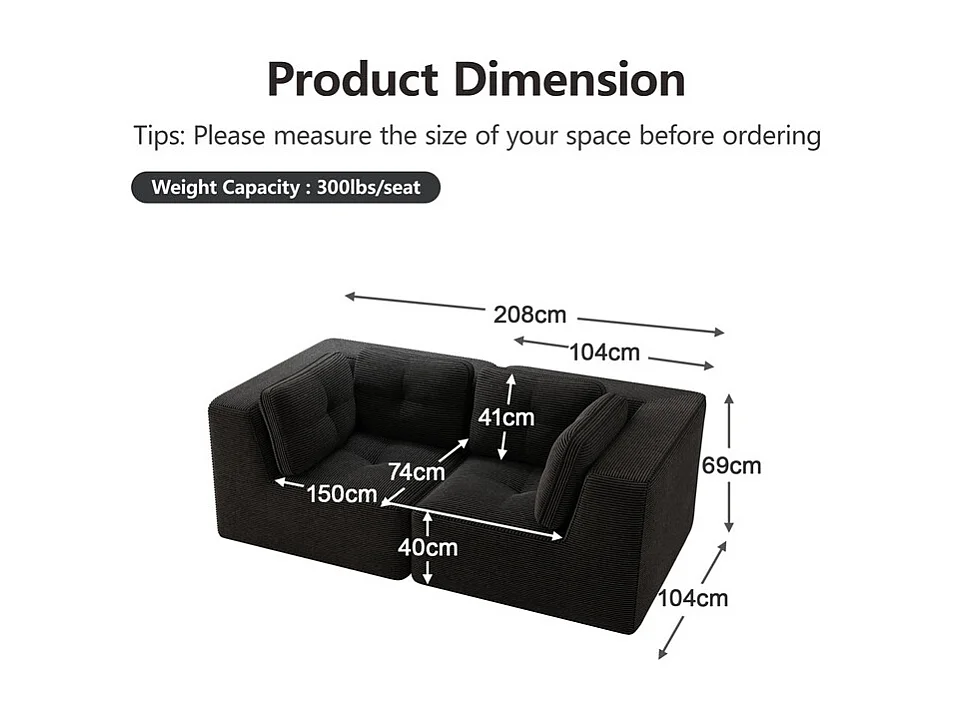 Canapé 2 places modulable en velours côtelé noir - avec 4 coussins - 208x104x69cm