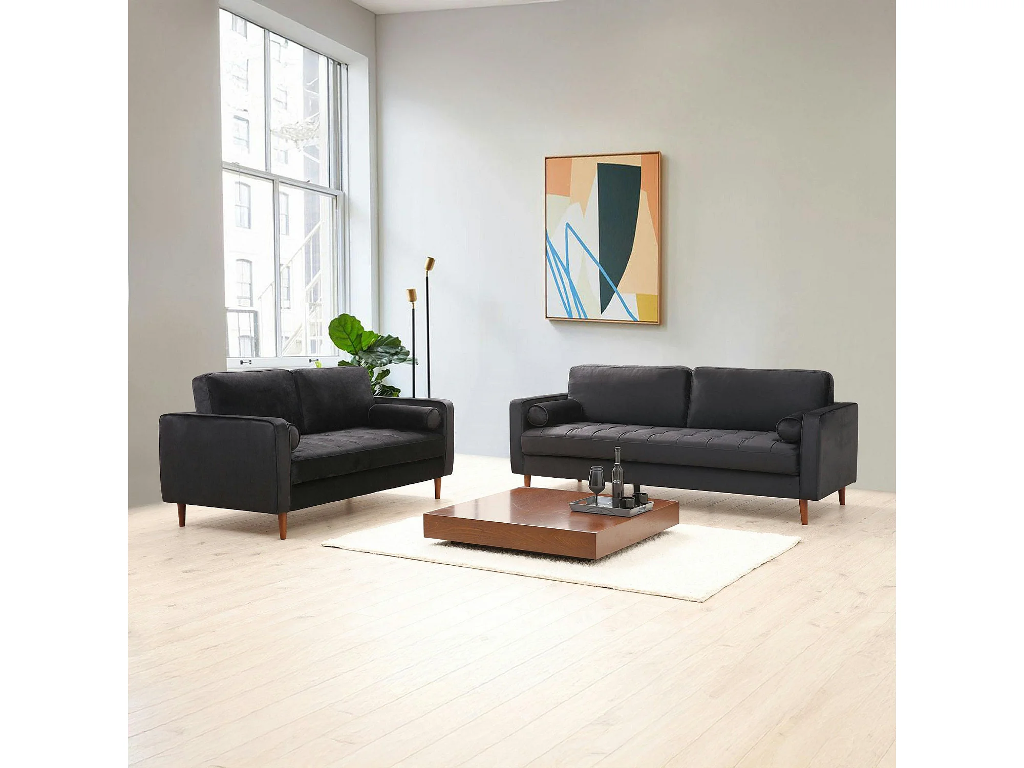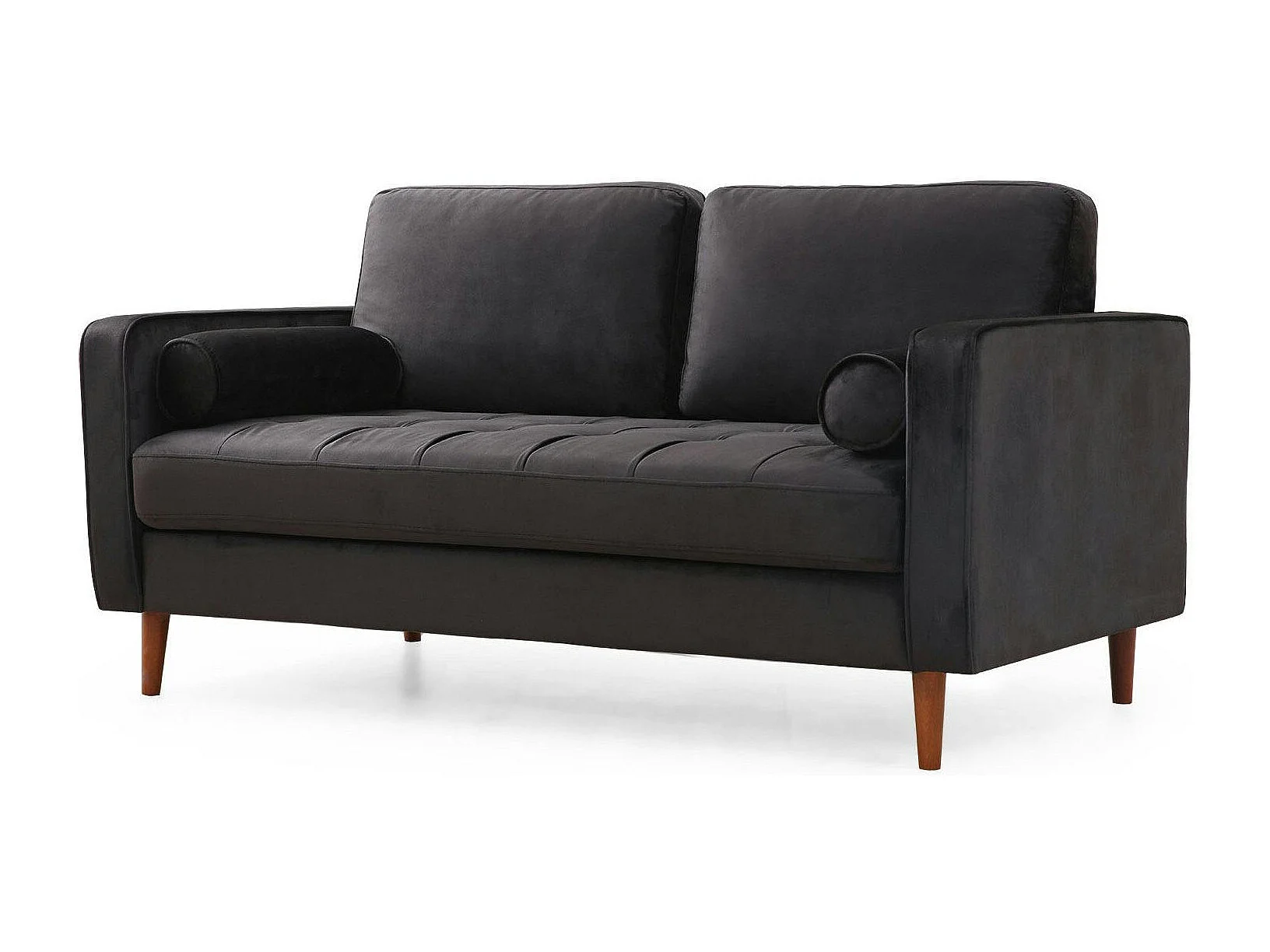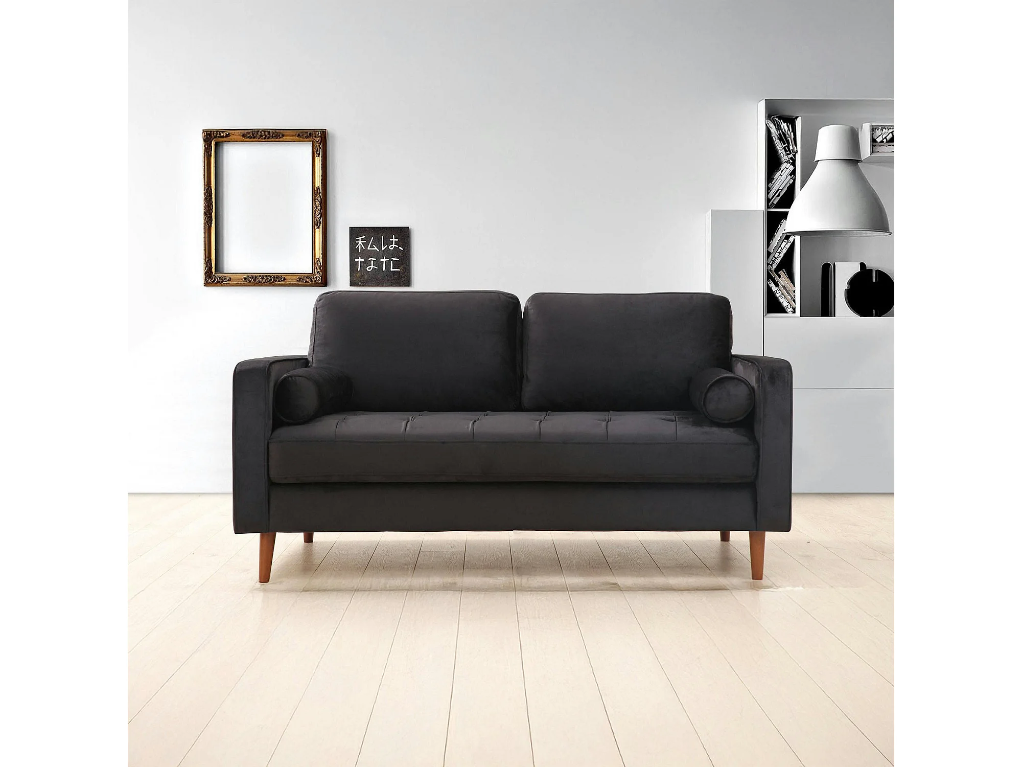 Canapé 2 places velours noir avec coussins polochons CHIBA