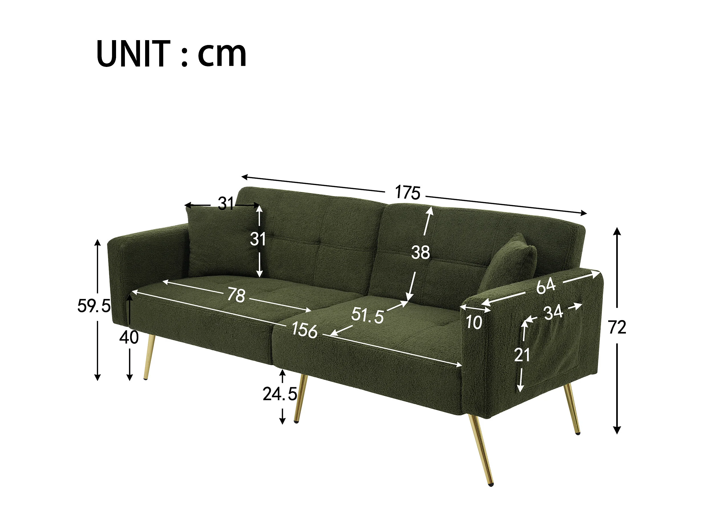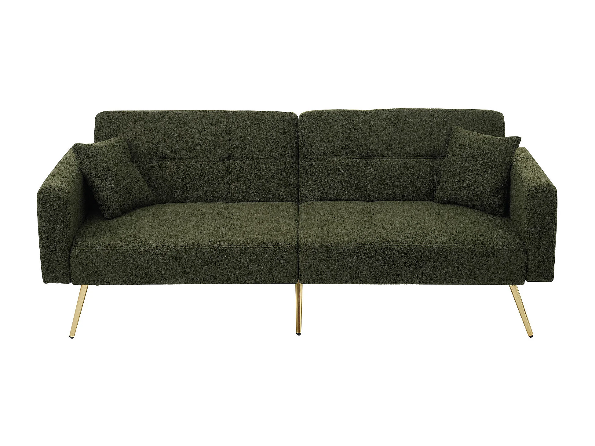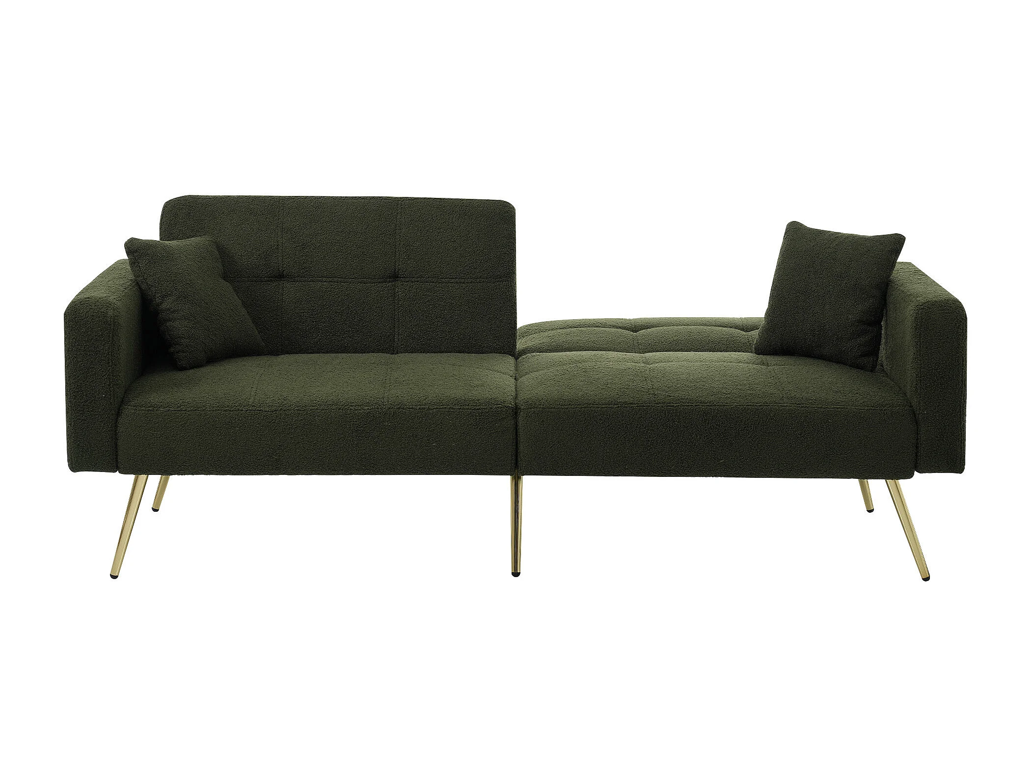 Canape 2 places vert - Canapé avec coussins et poches de rangement - pieds dorés - pour salon et chambre