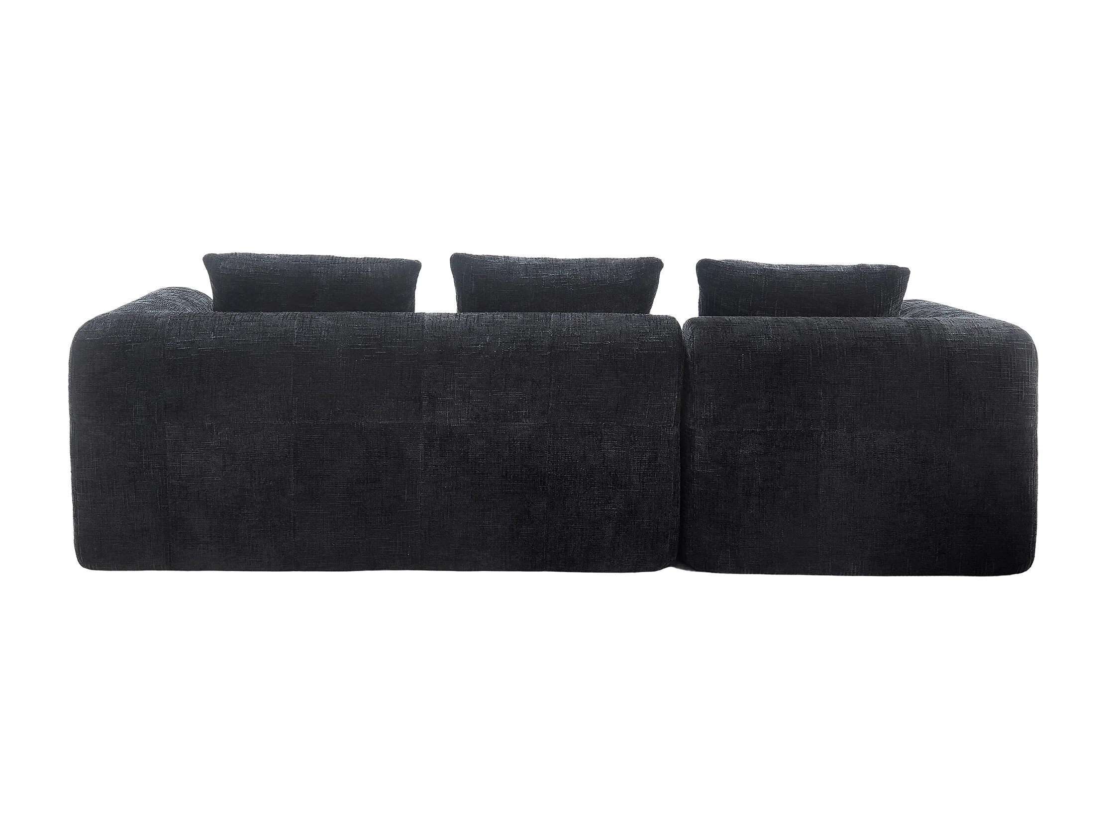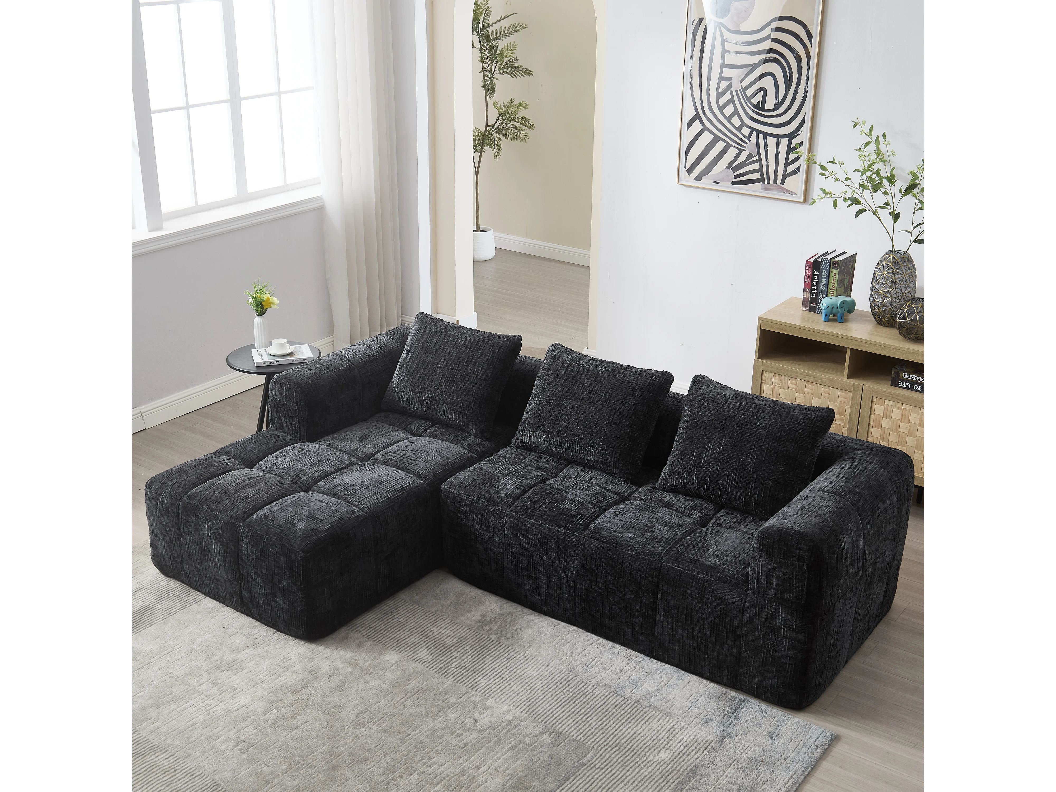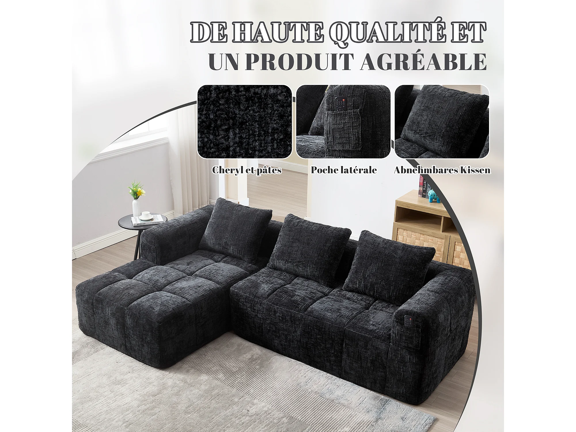 Canapé 3 place d'angle en L avec 3 coussins et poche latérale - Chenille noir