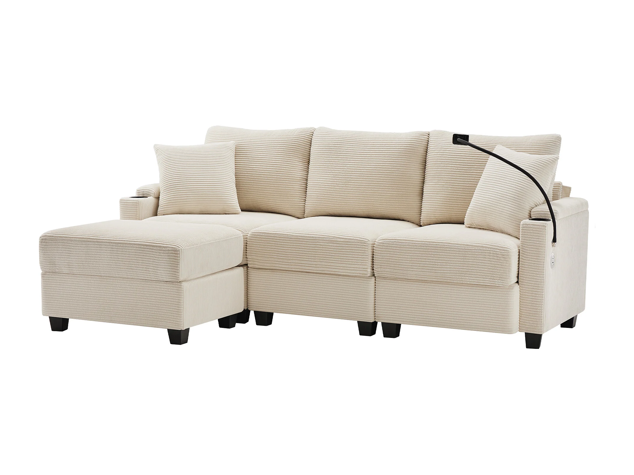 Canapé 3 places avec repose-pieds, port USB, 2 coussins - Velours côtelé - Beige