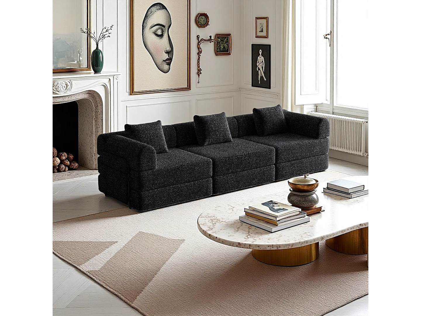 Canapé 3 places, Canapé convertible avec accoudoirs et poches latérales, structure en métal - Chenille noire