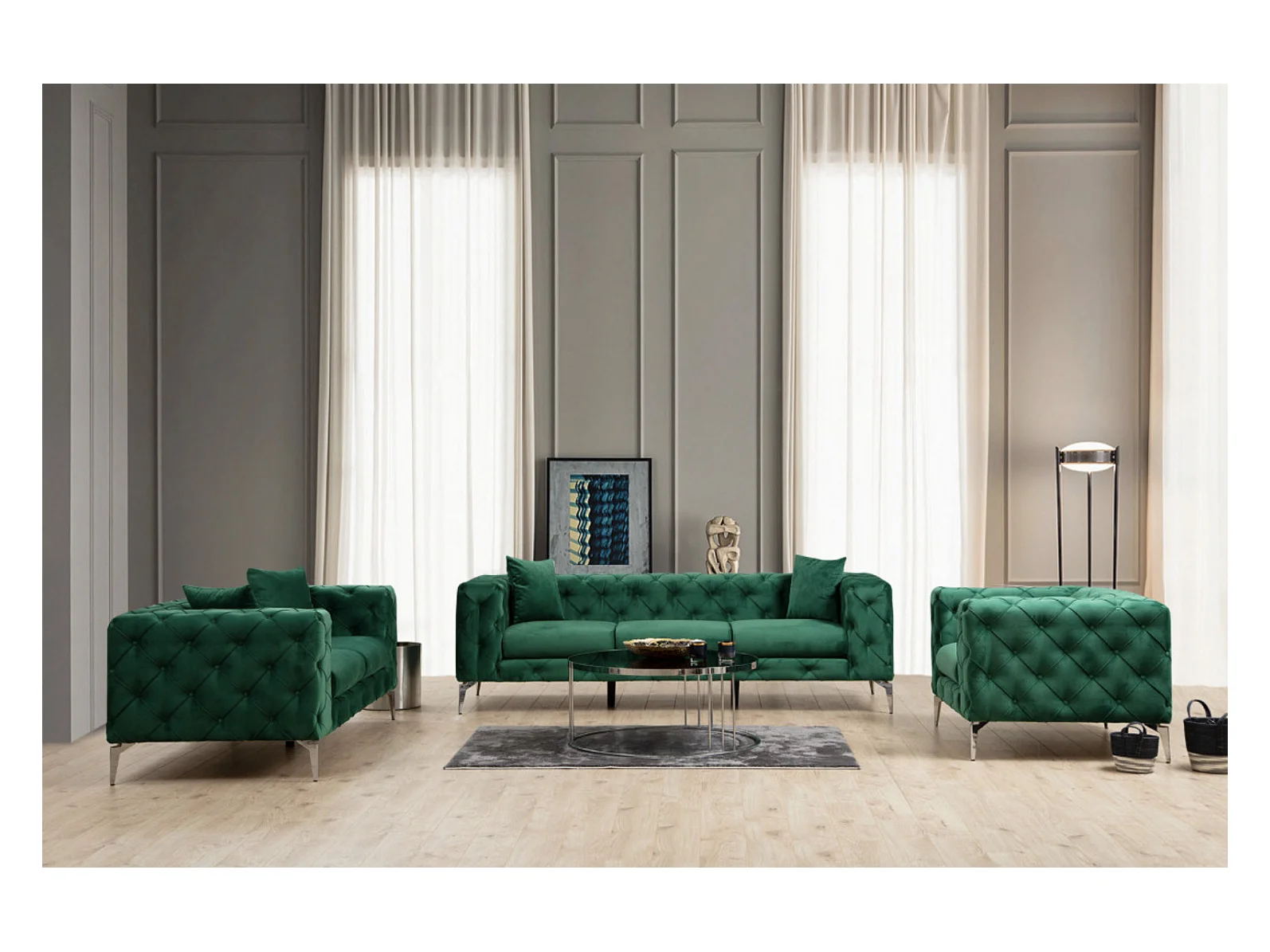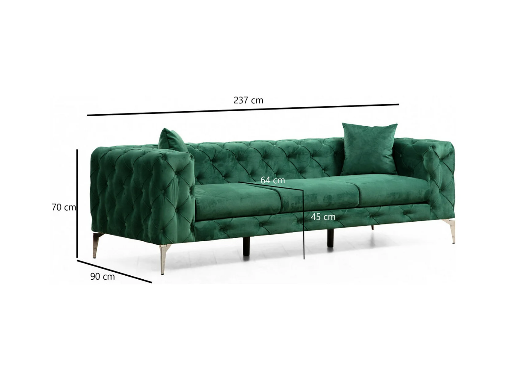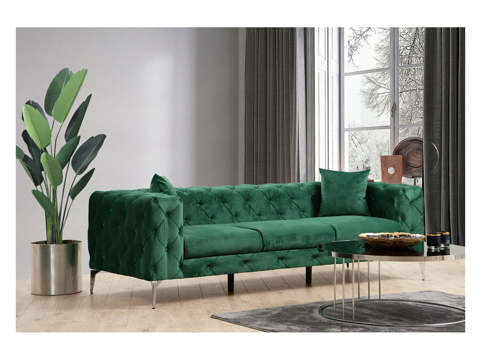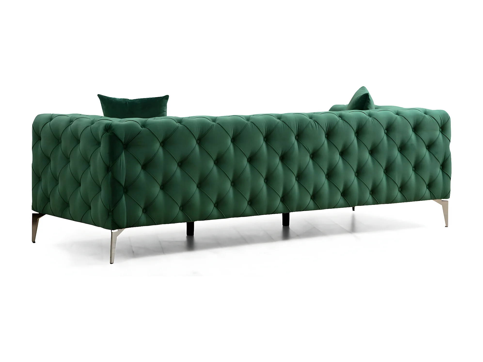 Canapé 3 places capitonné velours vert et pieds chromés Herakles 237cm