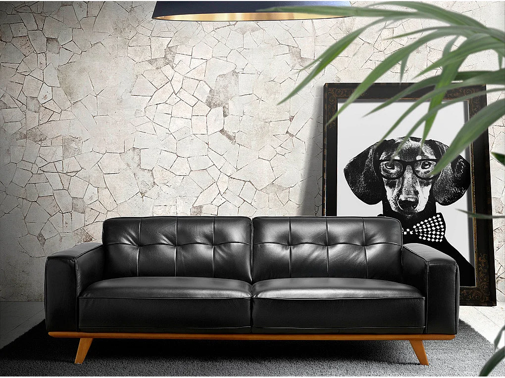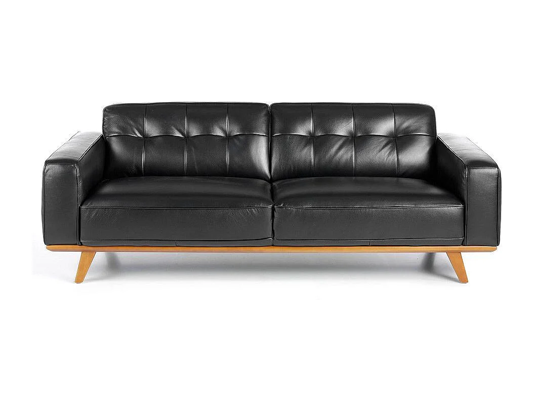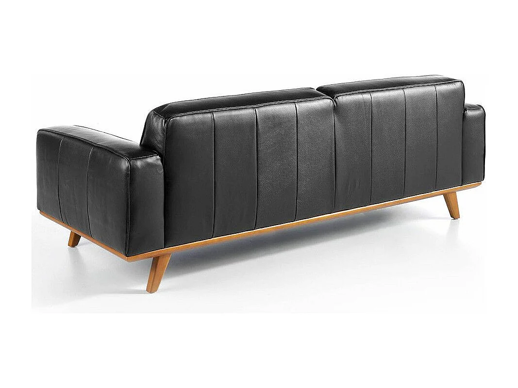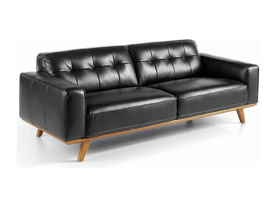 Canapé 3 places cuir noir matelassé et pieds bois massif Kiro