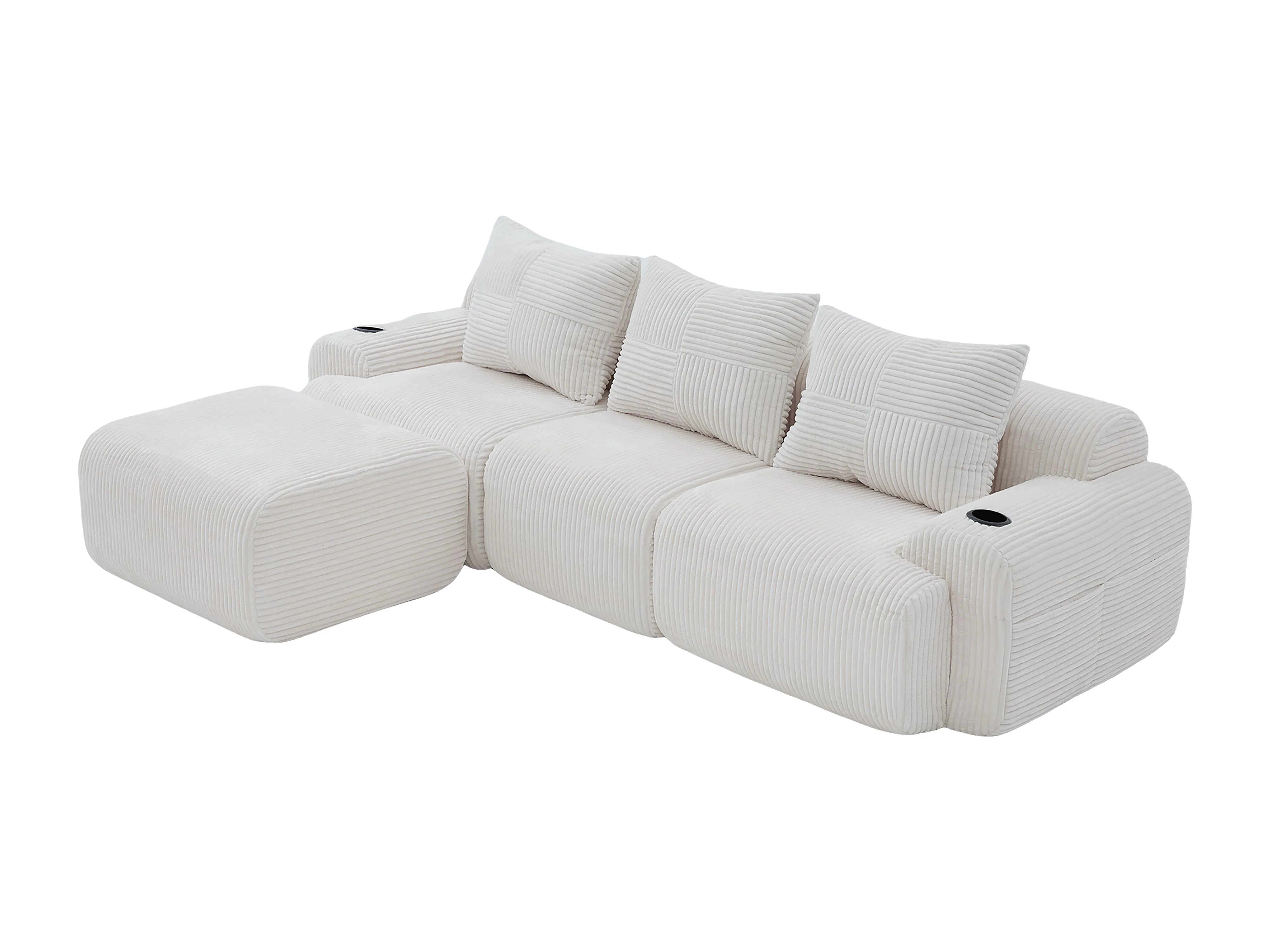 Canapé 3 places d'angle modulable en Velours côtelé, avec pouf, porte-gobelets et poche latérale, 268x174x80cm, Beige
