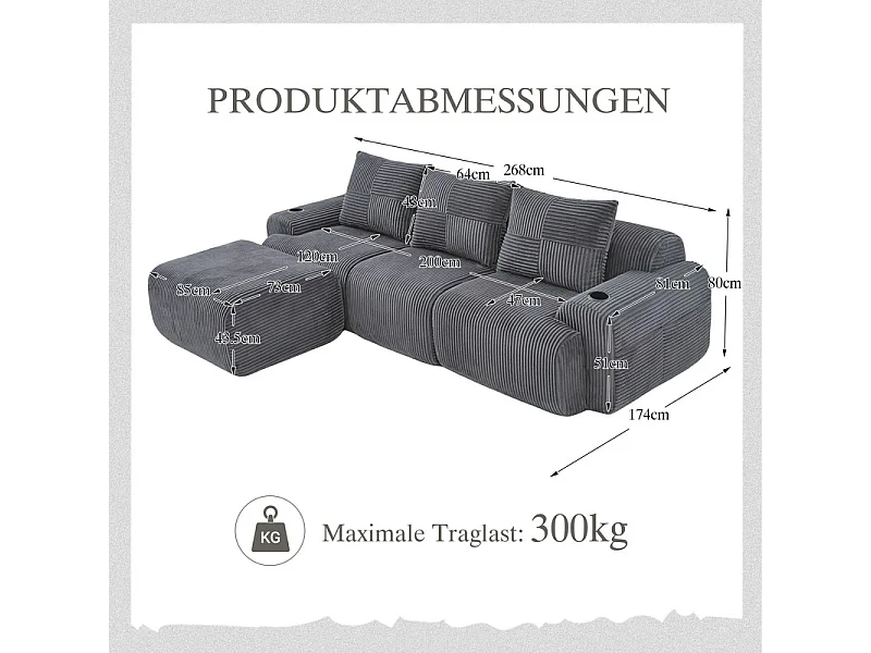 Canapé 3 places d'angle modulable en Velours côtelé, avec pouf, porte-gobelets et poche latérale, 268x174x80cm, Gris anthracite