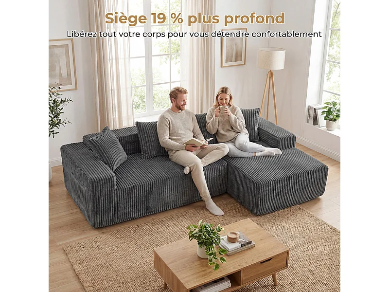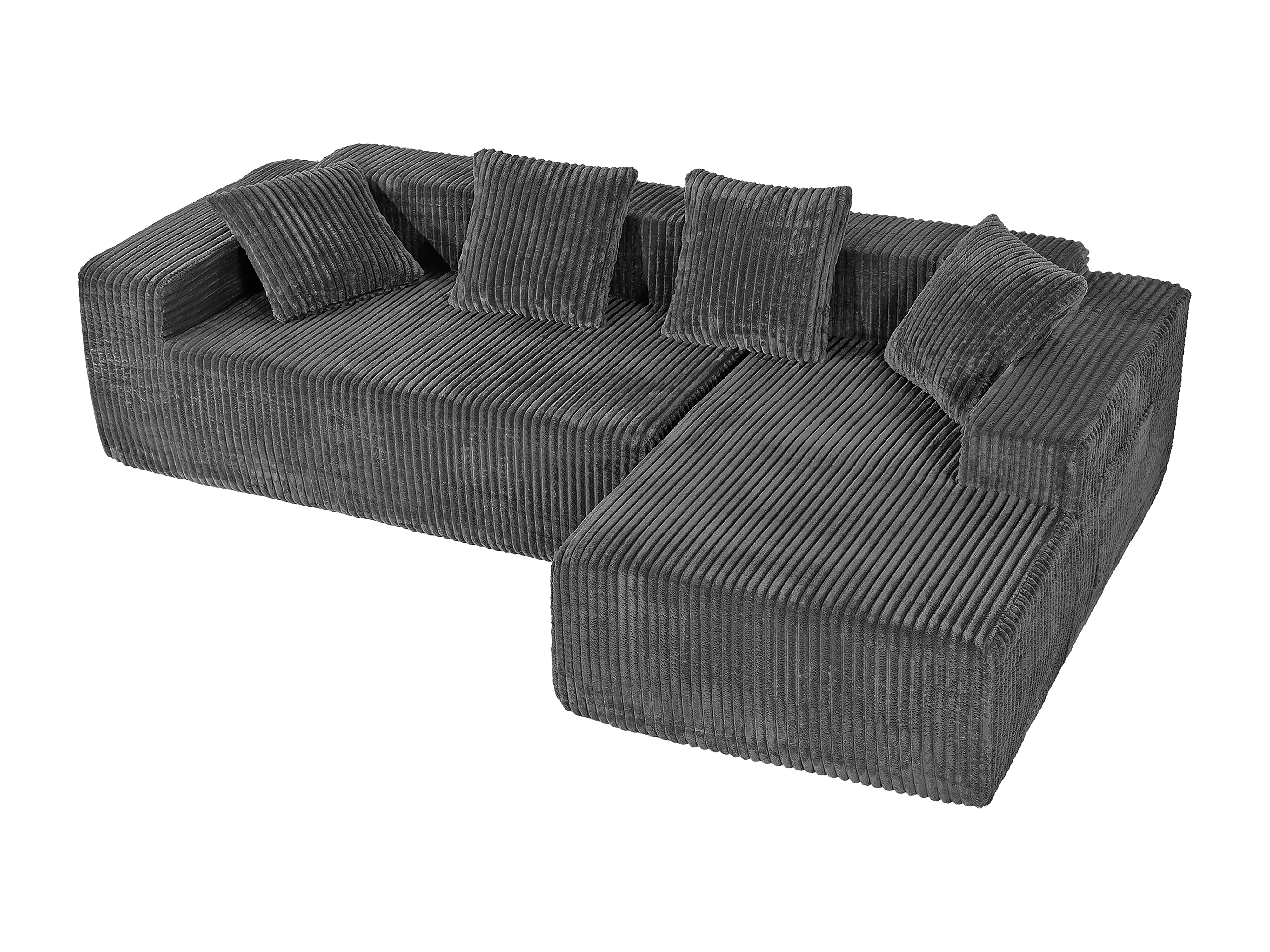 Canapé 3 Places d'angle droite modulable, en Velours côtelé gris, avec 4 Coussins, méridienne et poche latérale, 261x156x80cm