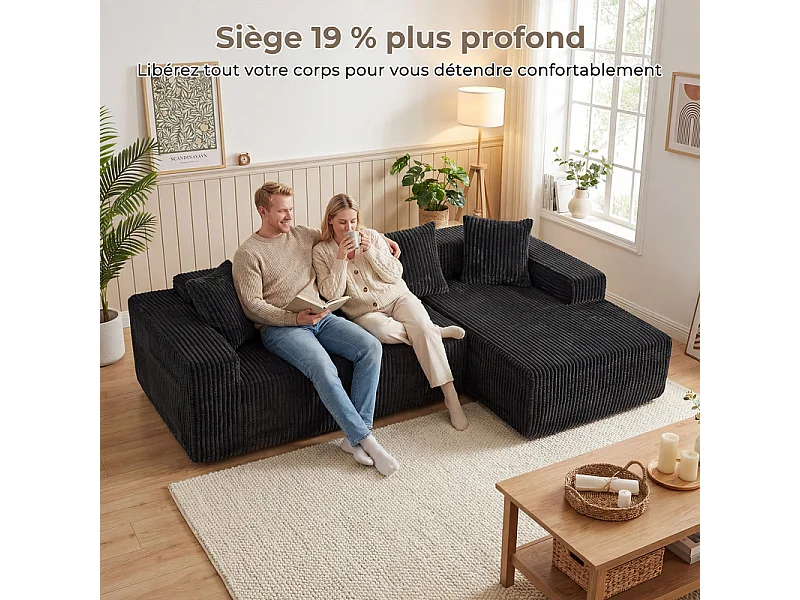 Canapé 3 Places d'angle droite modulable, en Velours côtelé noir, avec 4 Coussins, méridienne et poche latérale, 261x156x80cm