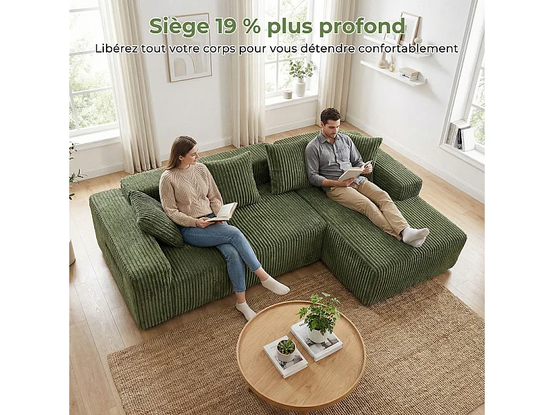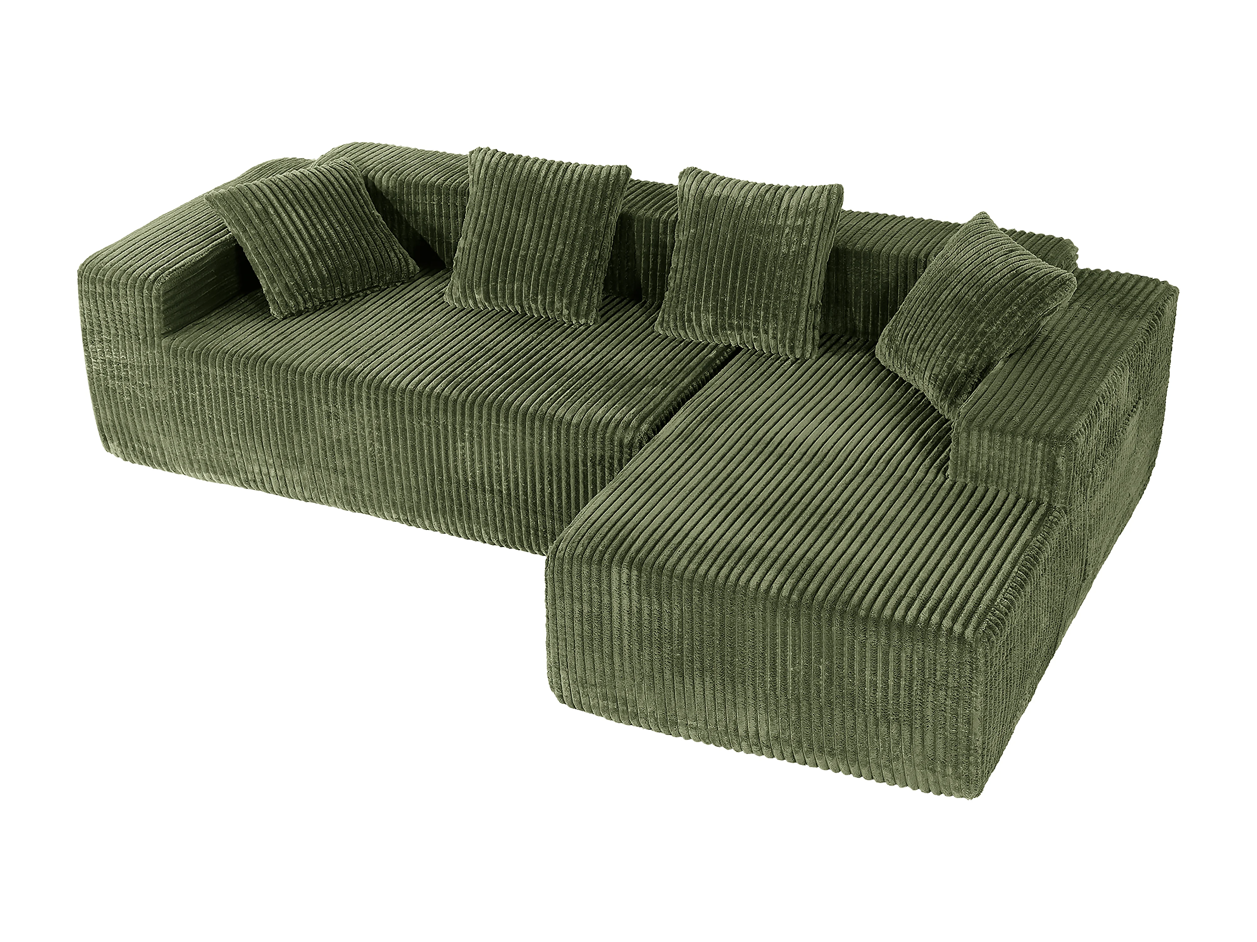 Canapé 3 Places d'angle droite modulable, en Velours côtelé vert, avec 4 Coussins, méridienne et poche latérale, 261x156x80cm