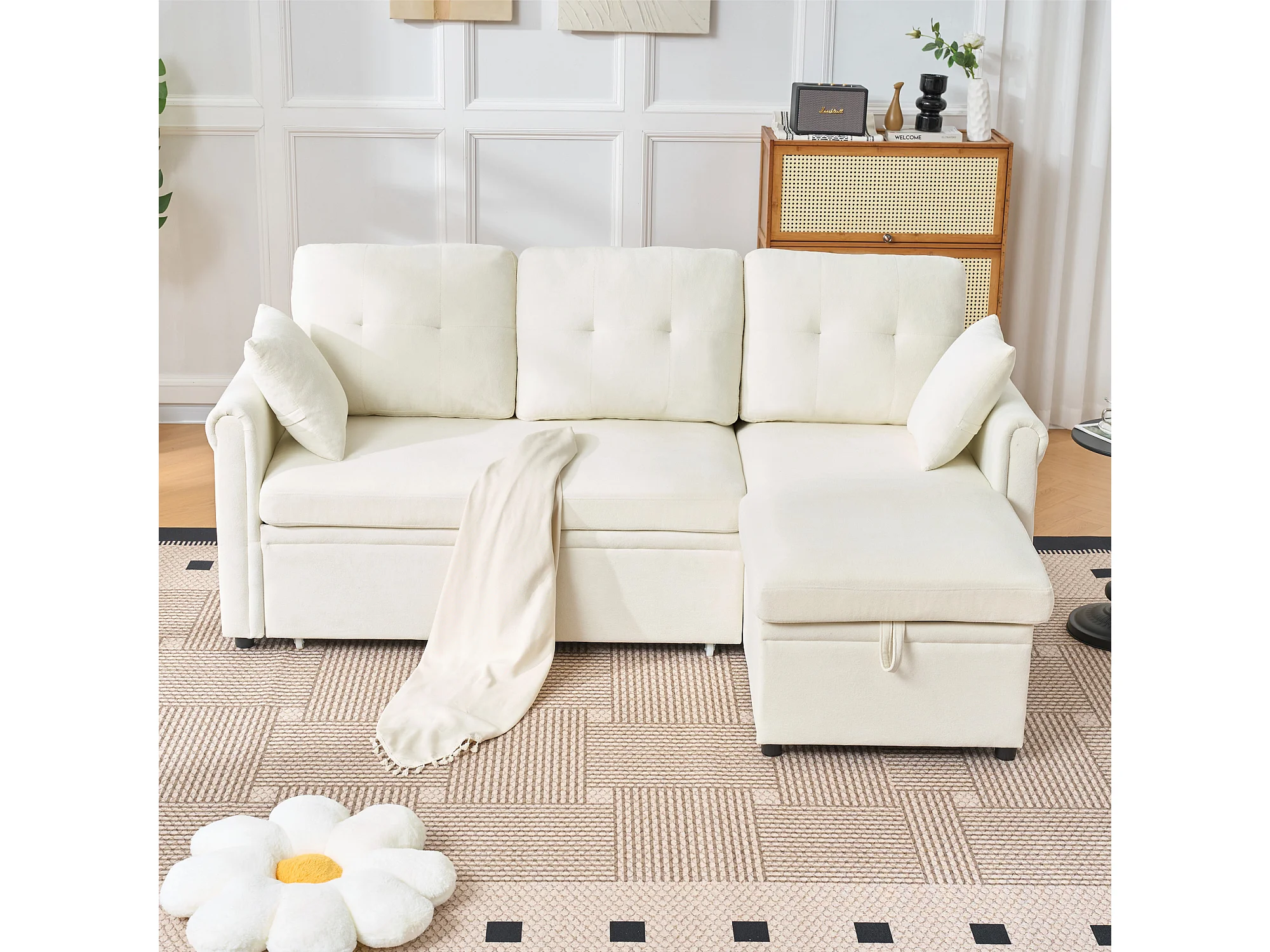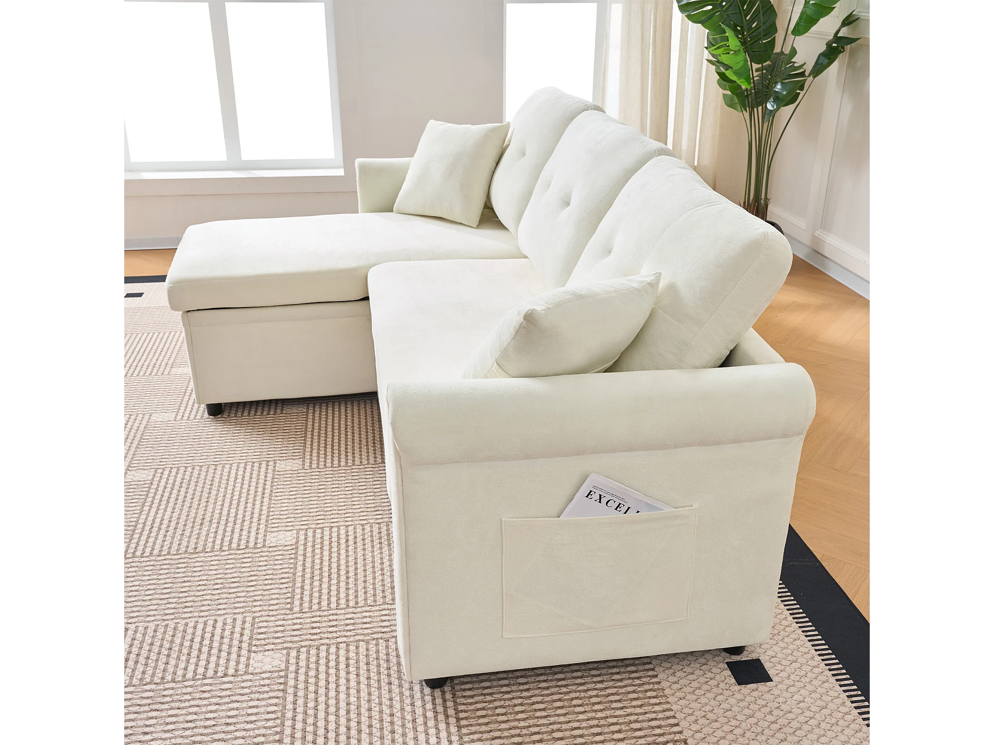 Canapé 3 places d'angle en forme de L - Canapé-lit avec rangmente et coussin - Tissu chenille beige