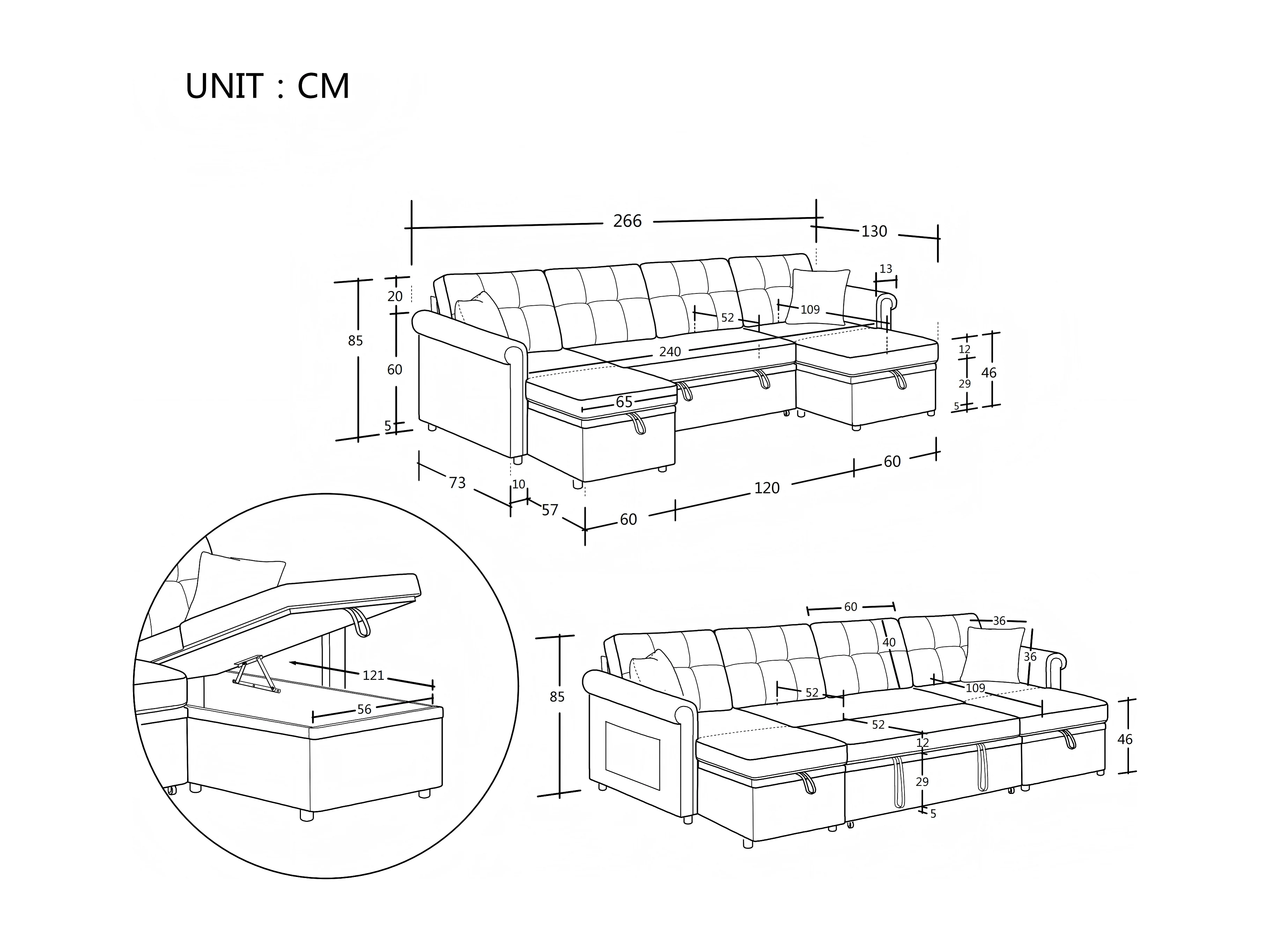 Canapé 3 places d'angle en forme de U avec rangement - Canapé-lit en tissu chenille - Beige