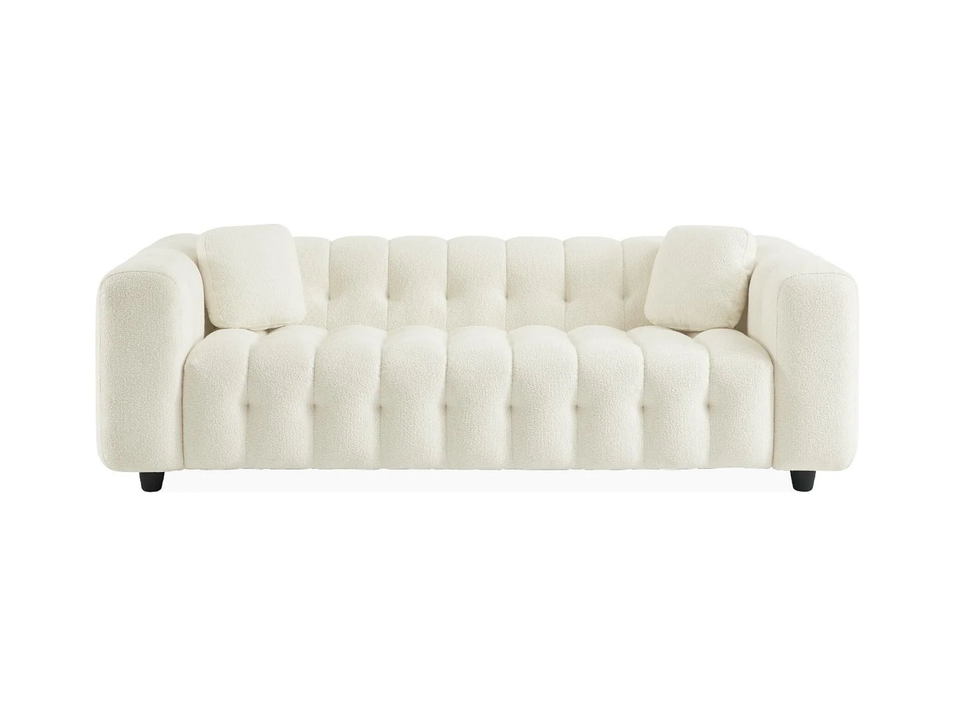 Canapé 3 places en bouclette texturée capitonné blanc crème - Structure bois d'eucalyptus et contreplaqué