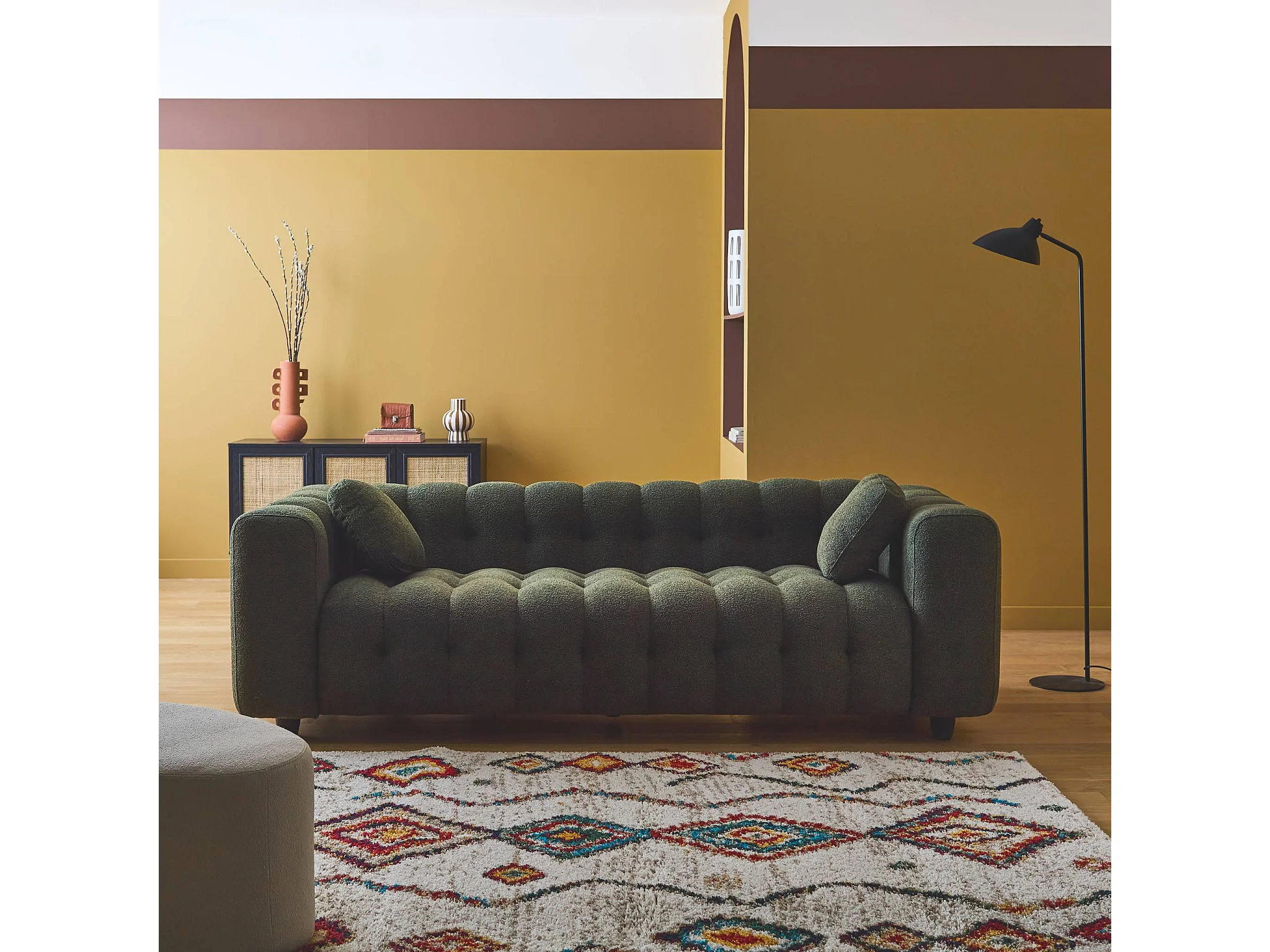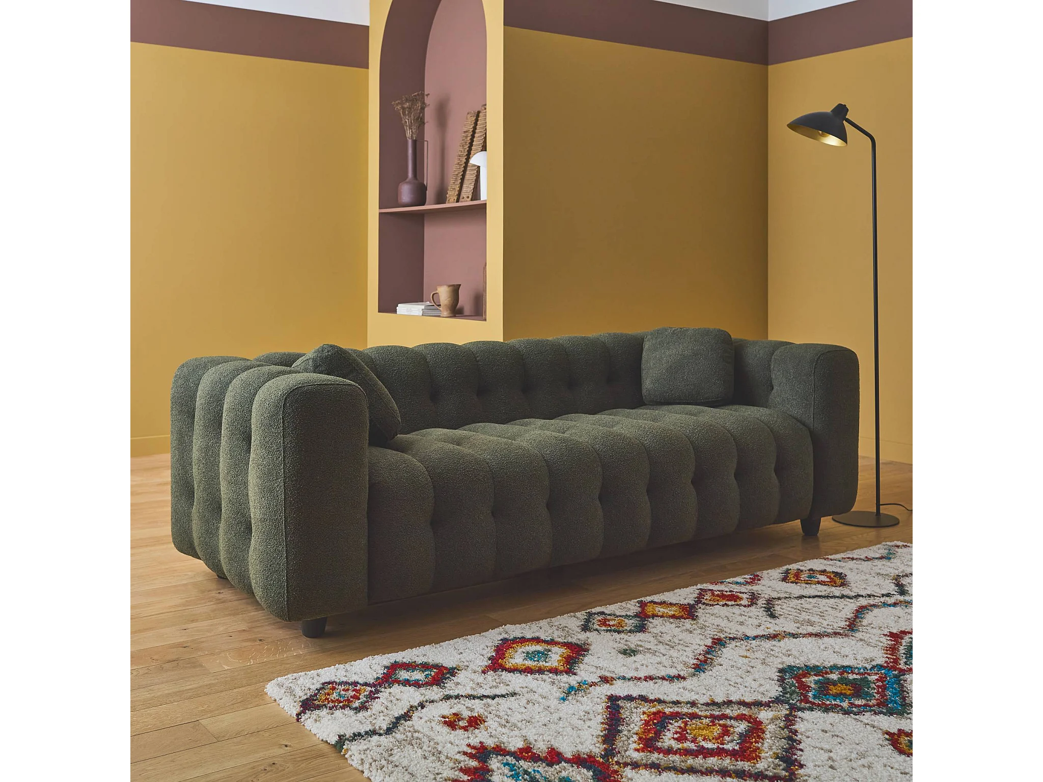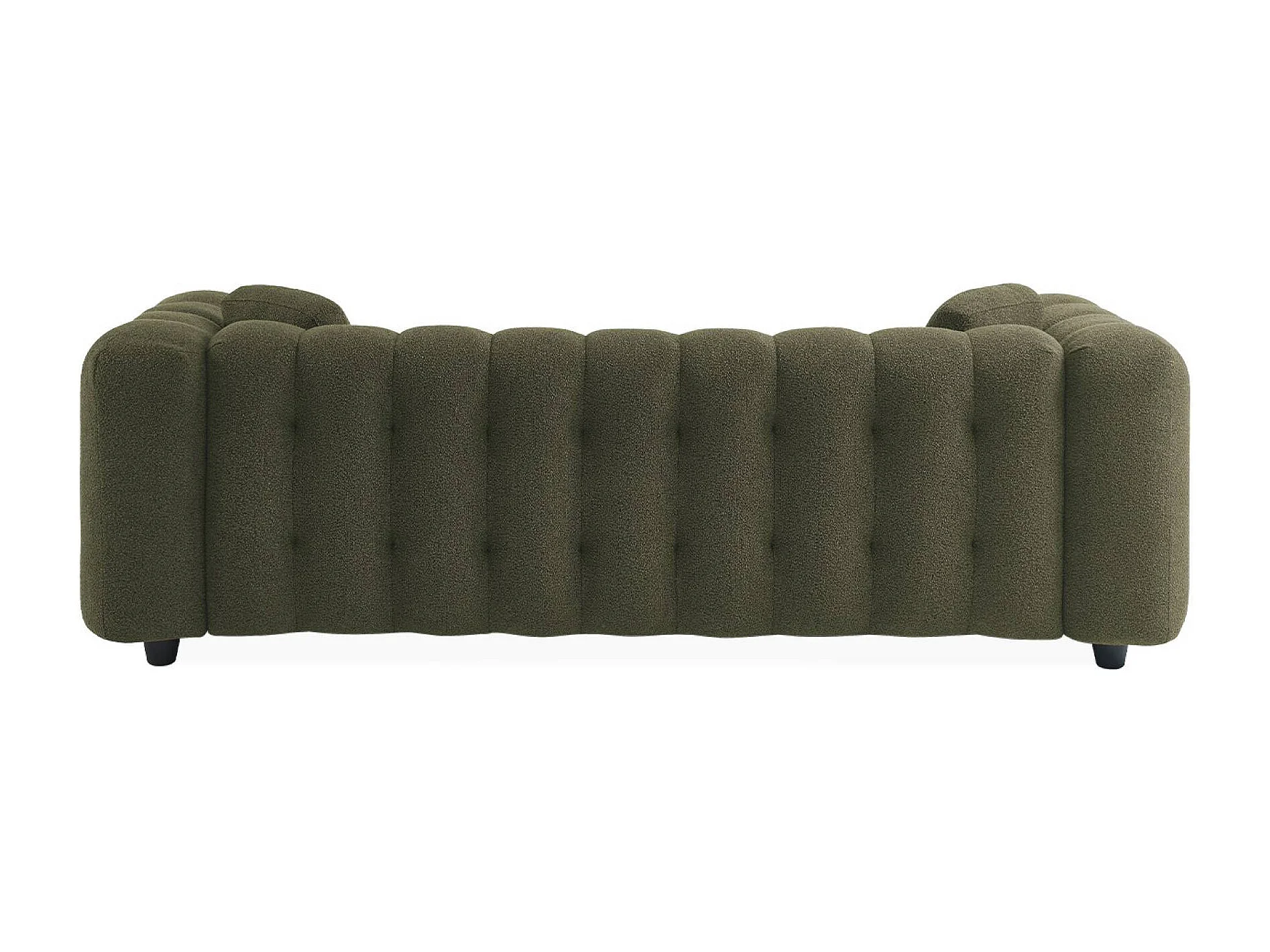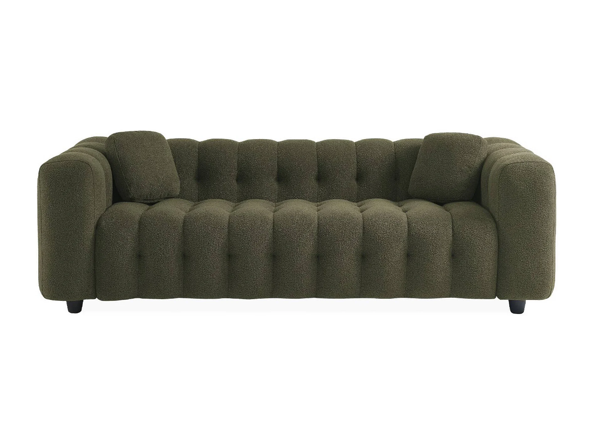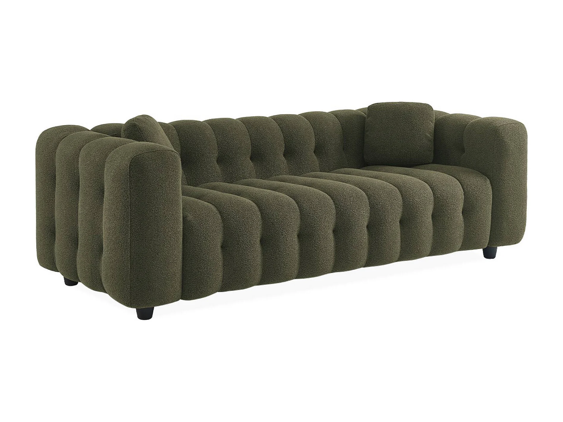 Canapé 3 places en bouclette texturée capitonné kaki foncé - Structure bois d'eucalyptus et contreplaqué