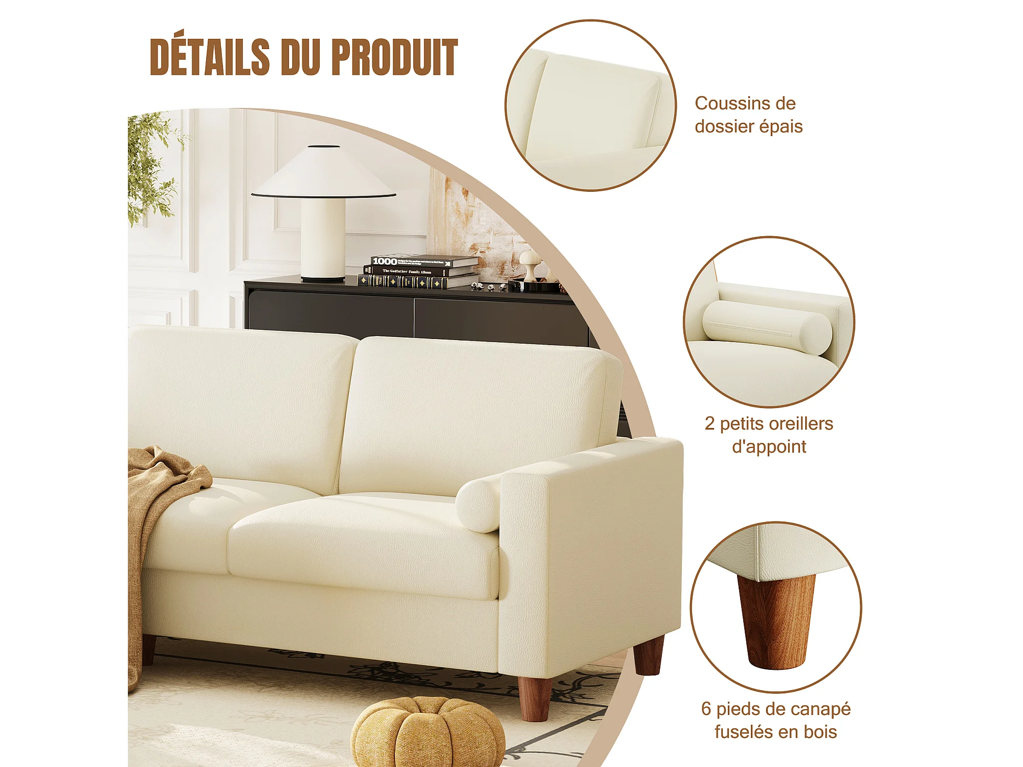 Canapé 3 places en simili, avec pouf et 2 oreillers rond, cadre en bois, 234x155x88cm, Beige