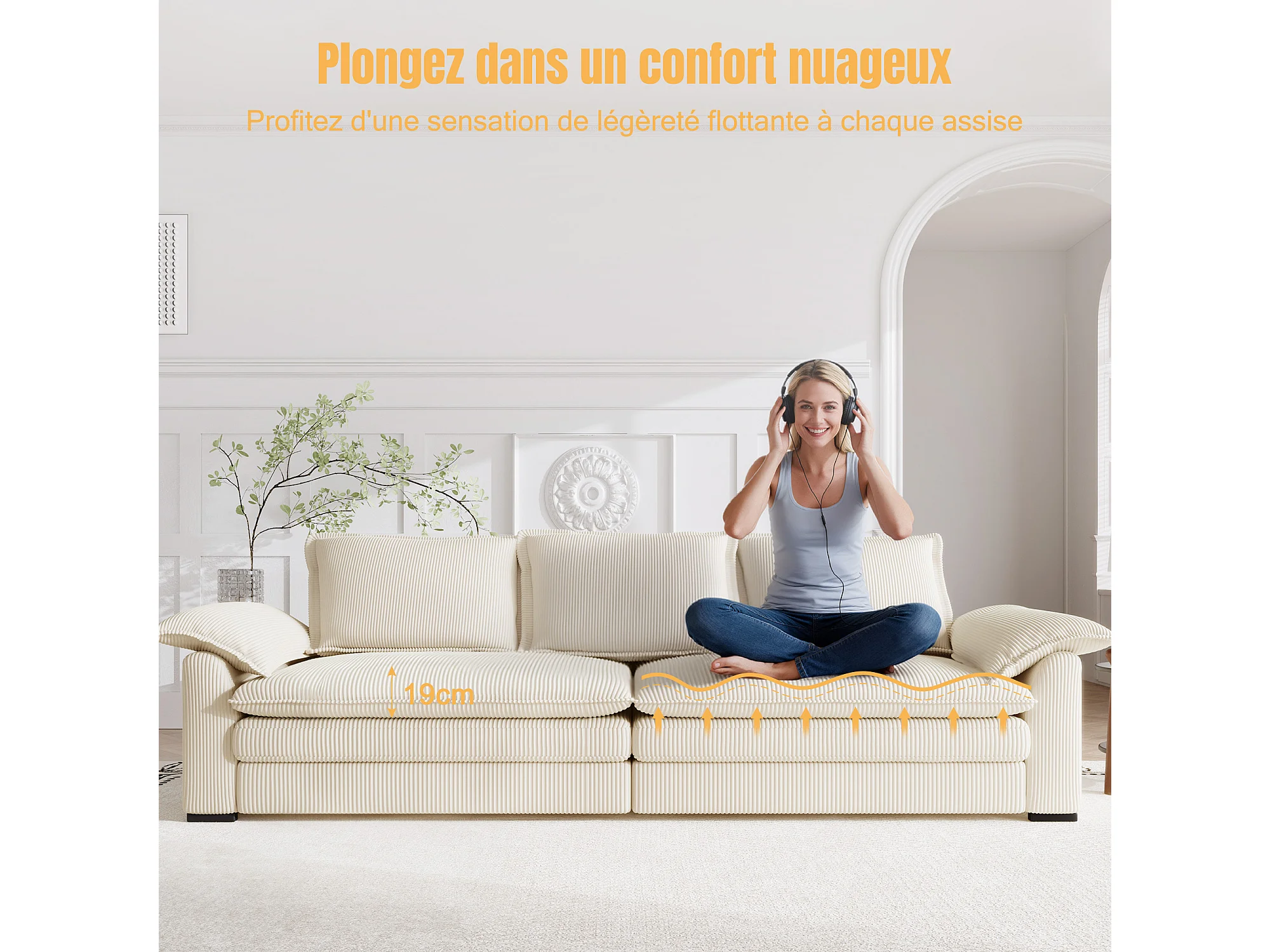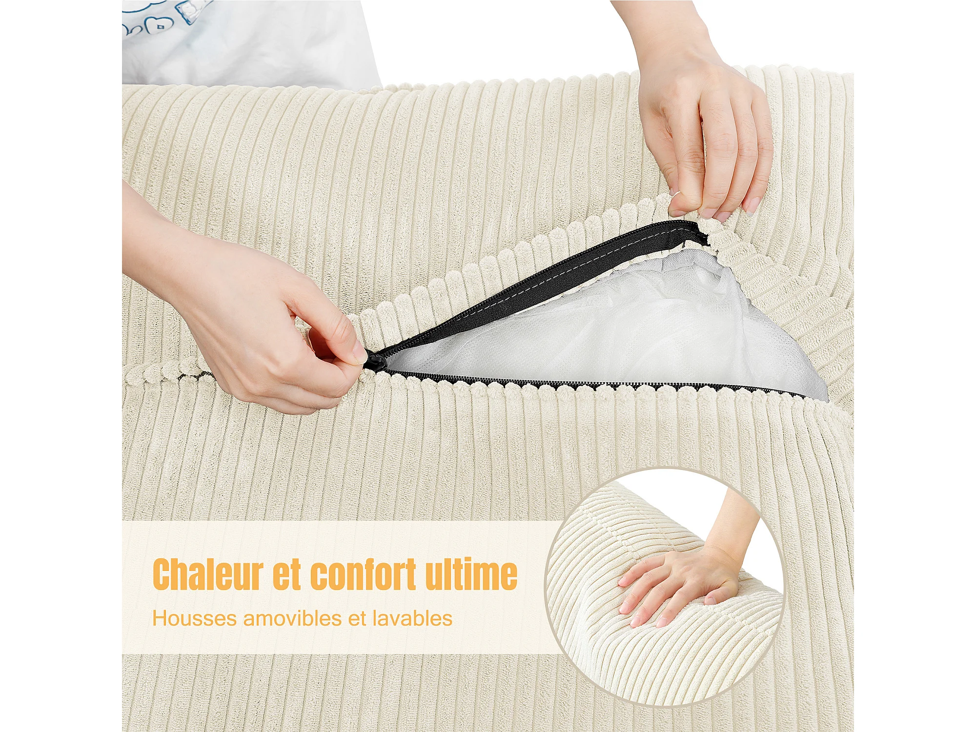 Canapé 3 places en velour côtelé, avec 2 oreillers d'accoudoir, amovible et lavable, 265x86x88cm, Gris