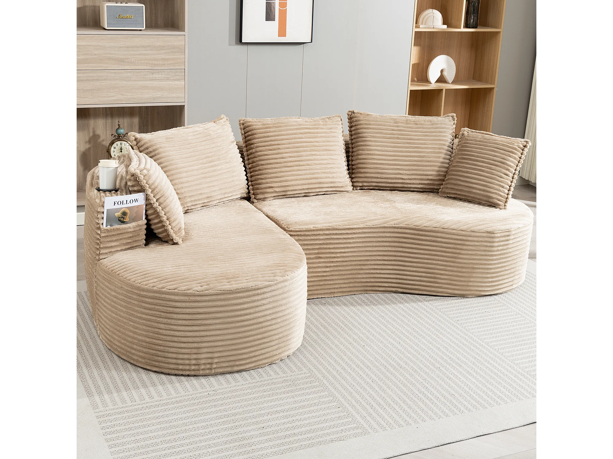 Canapé 3 places en velours côtelé - 250 x 152 x 82 cm - avec porte-gobelet + poche + coussins - kaki