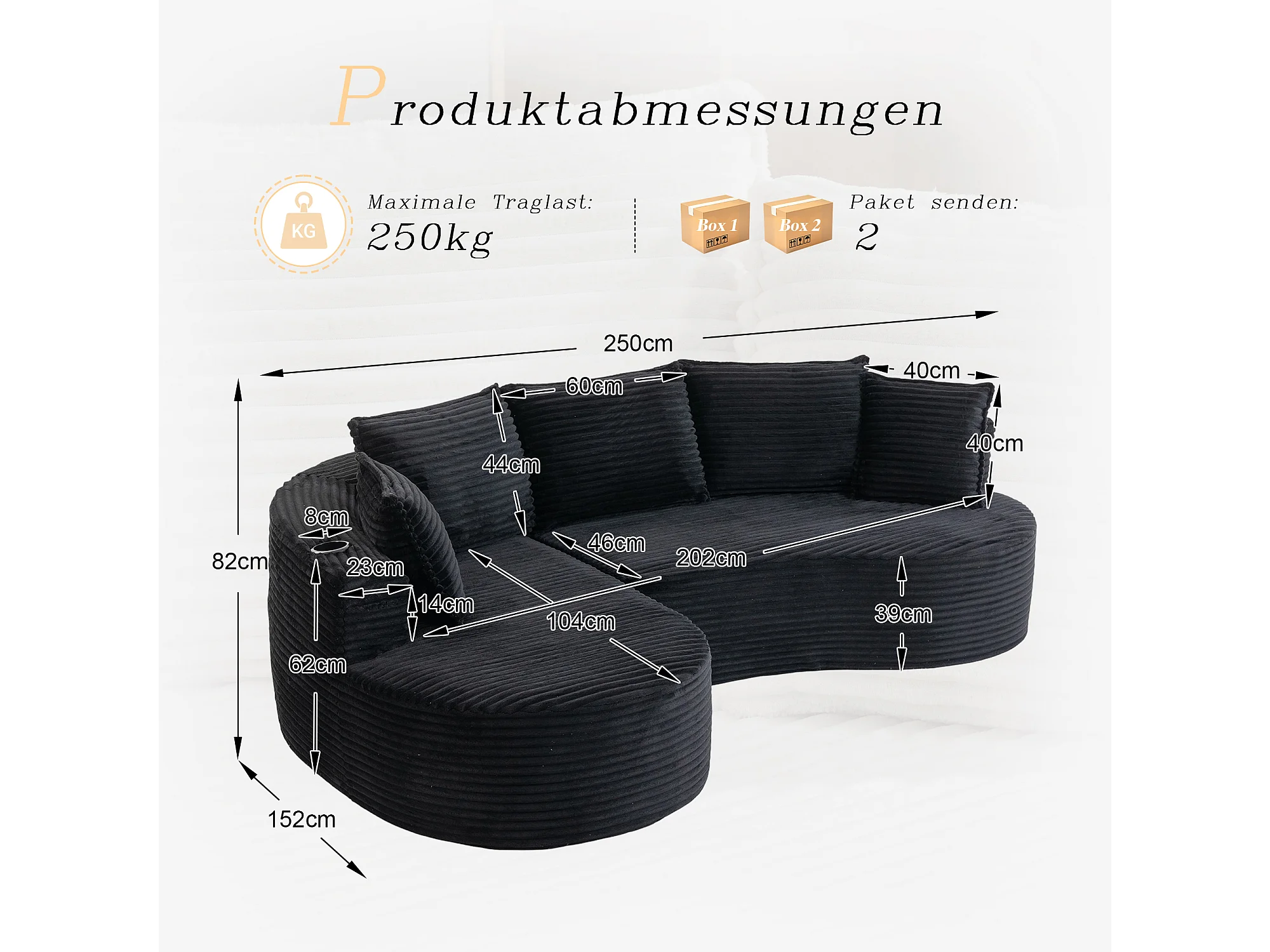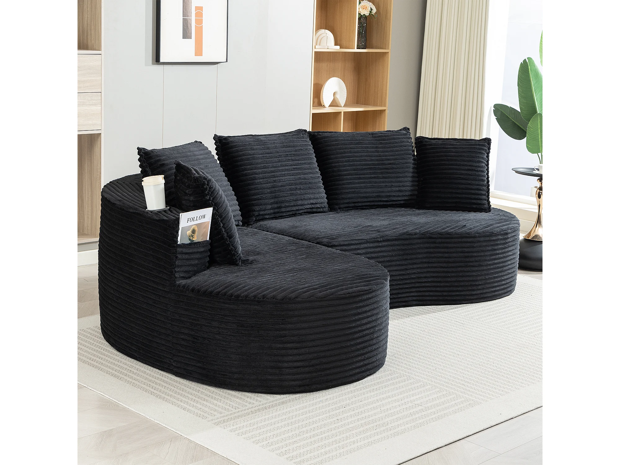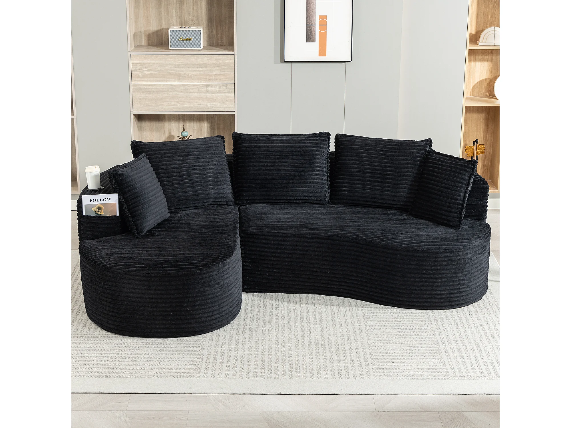 Canapé 3 places en velours côtelé - 250 x 152 x 82 cm - avec porte-gobelet + poche + coussins - noir