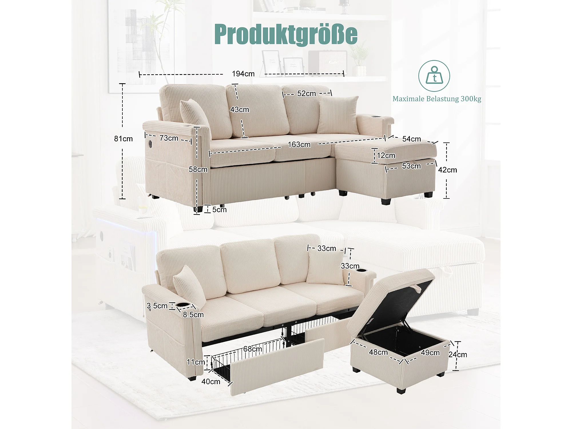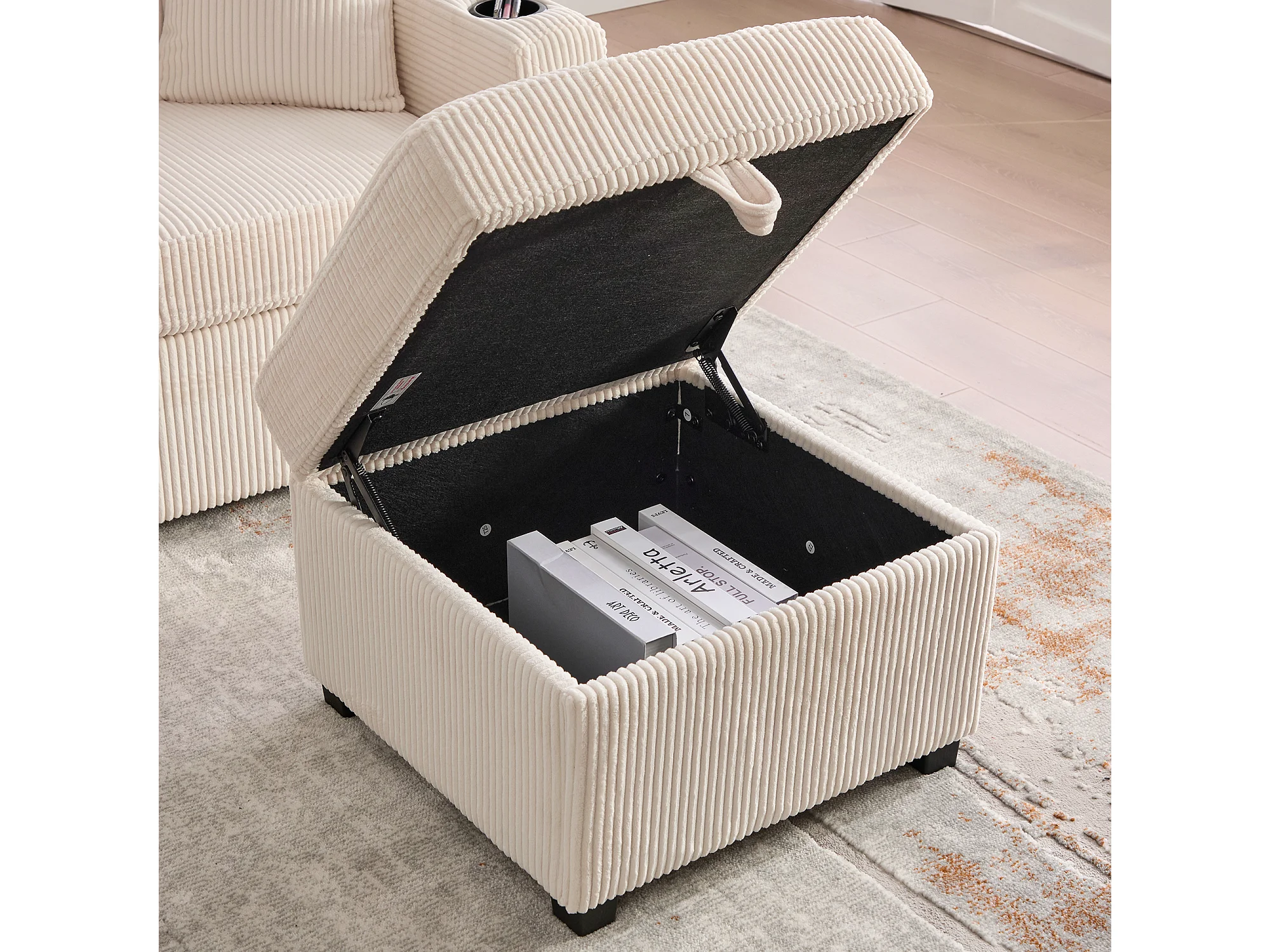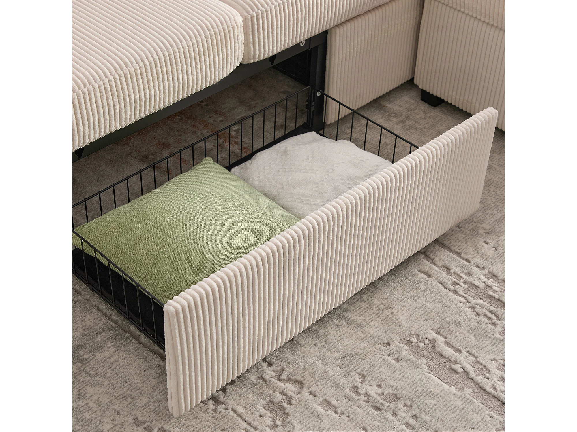 Canapé 3 places en velours côtelé beige avec LED et USB, repose-pieds de rangement et 2 tiroirs