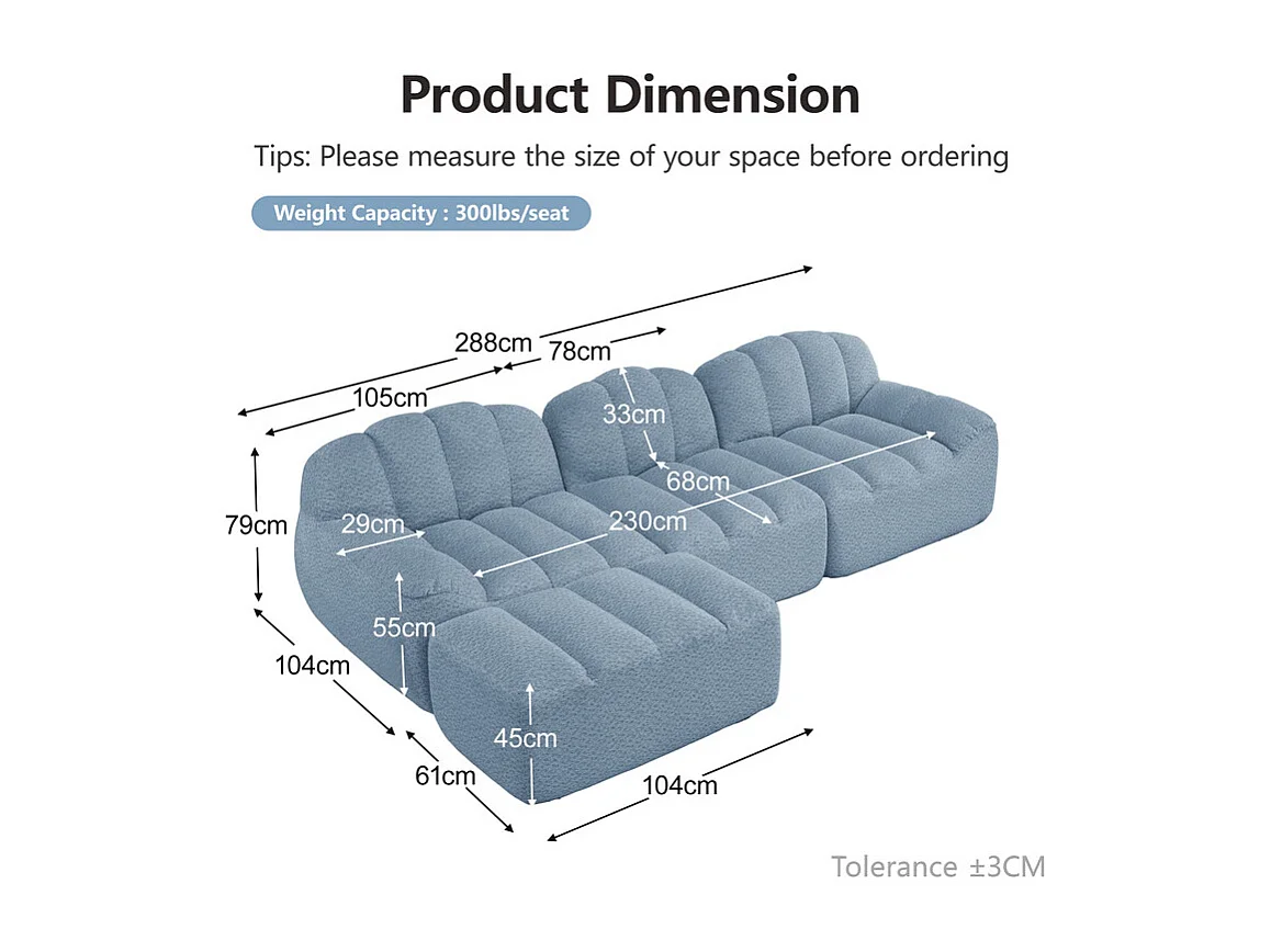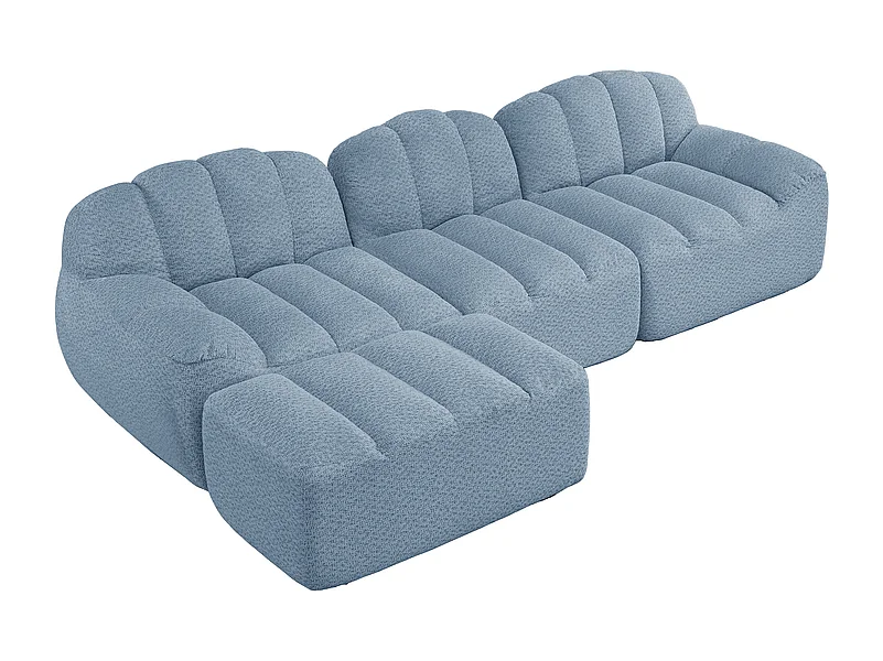 Canapé 3 places modulable en forme de L - avec pouf - velours côtelé - 288x165x79cm - Bleu