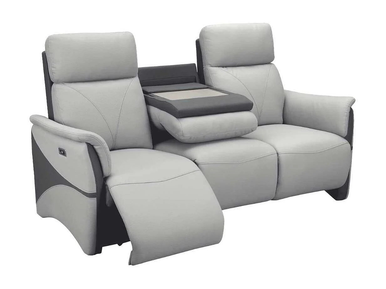 Canapé 3 places relax électrique tissu micro peau bicolore gris avec tablette centrale - SYMPHONY