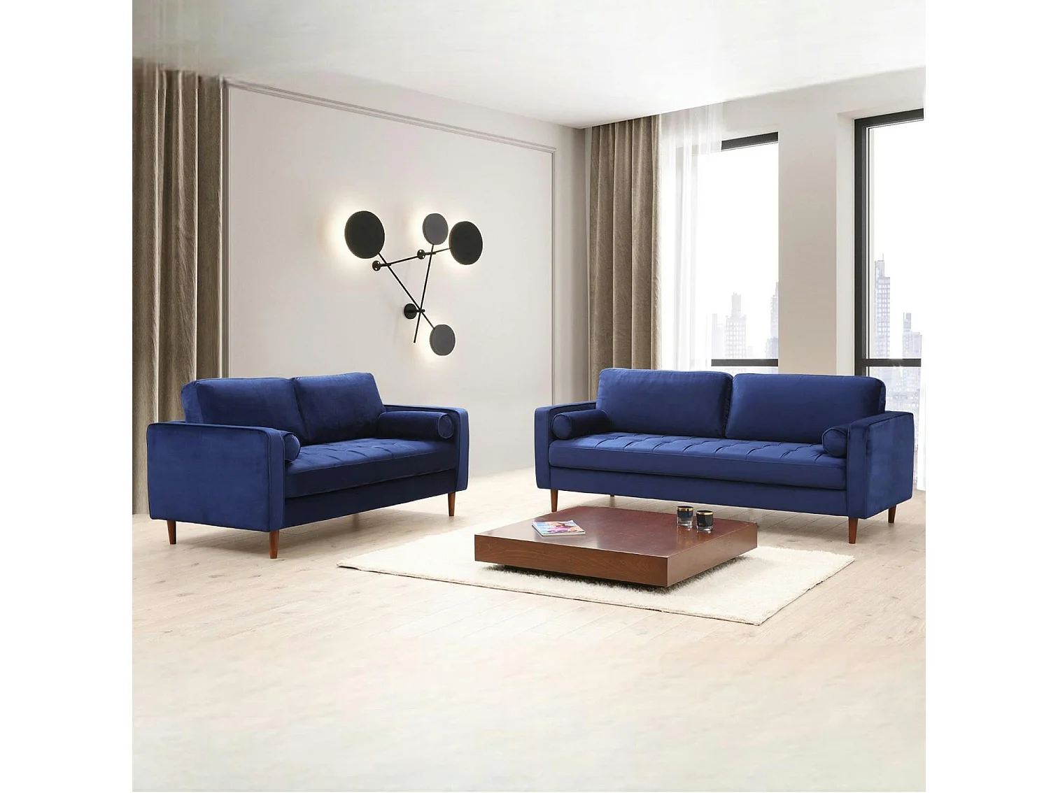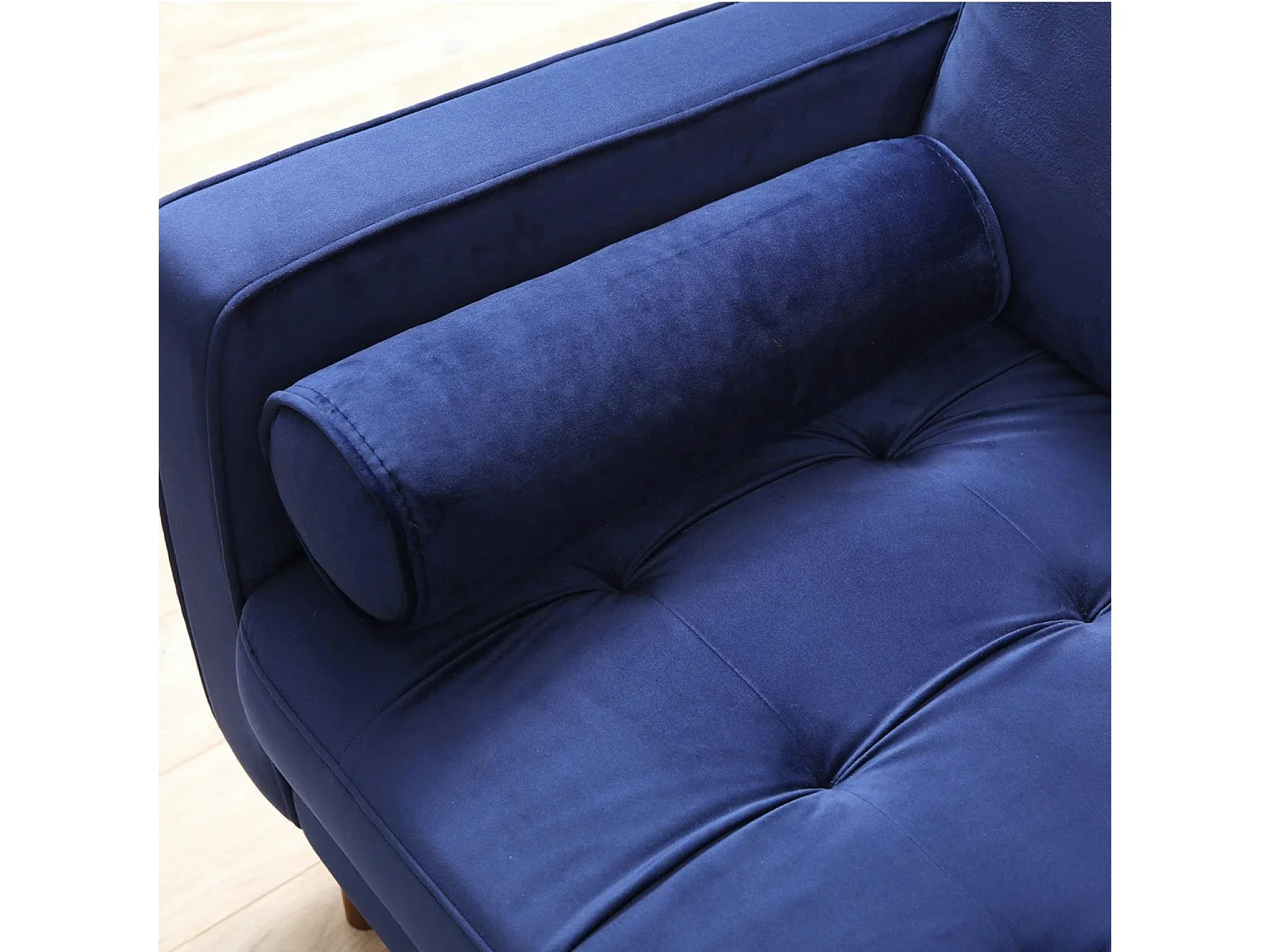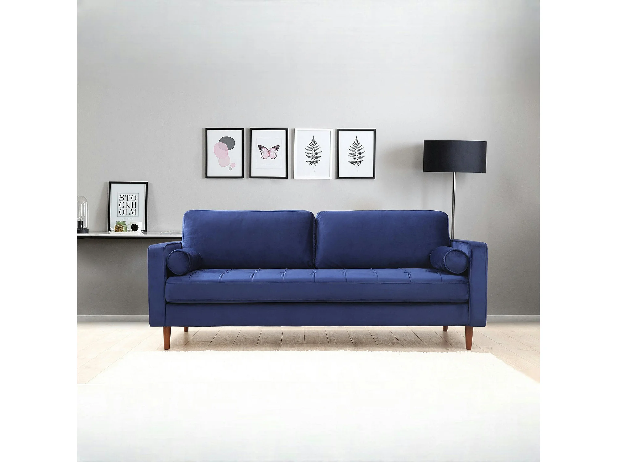 Canapé 3 places velours bleu avec coussins polochons CHIBA