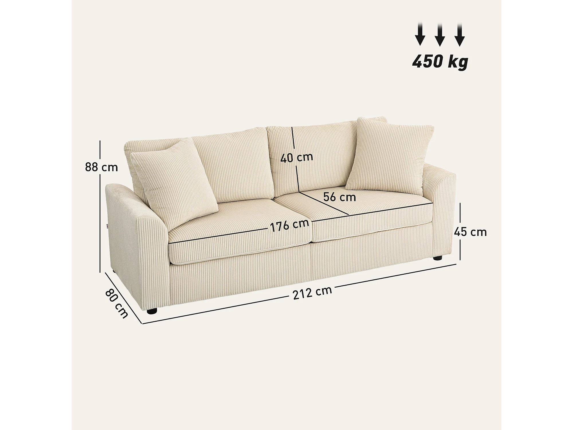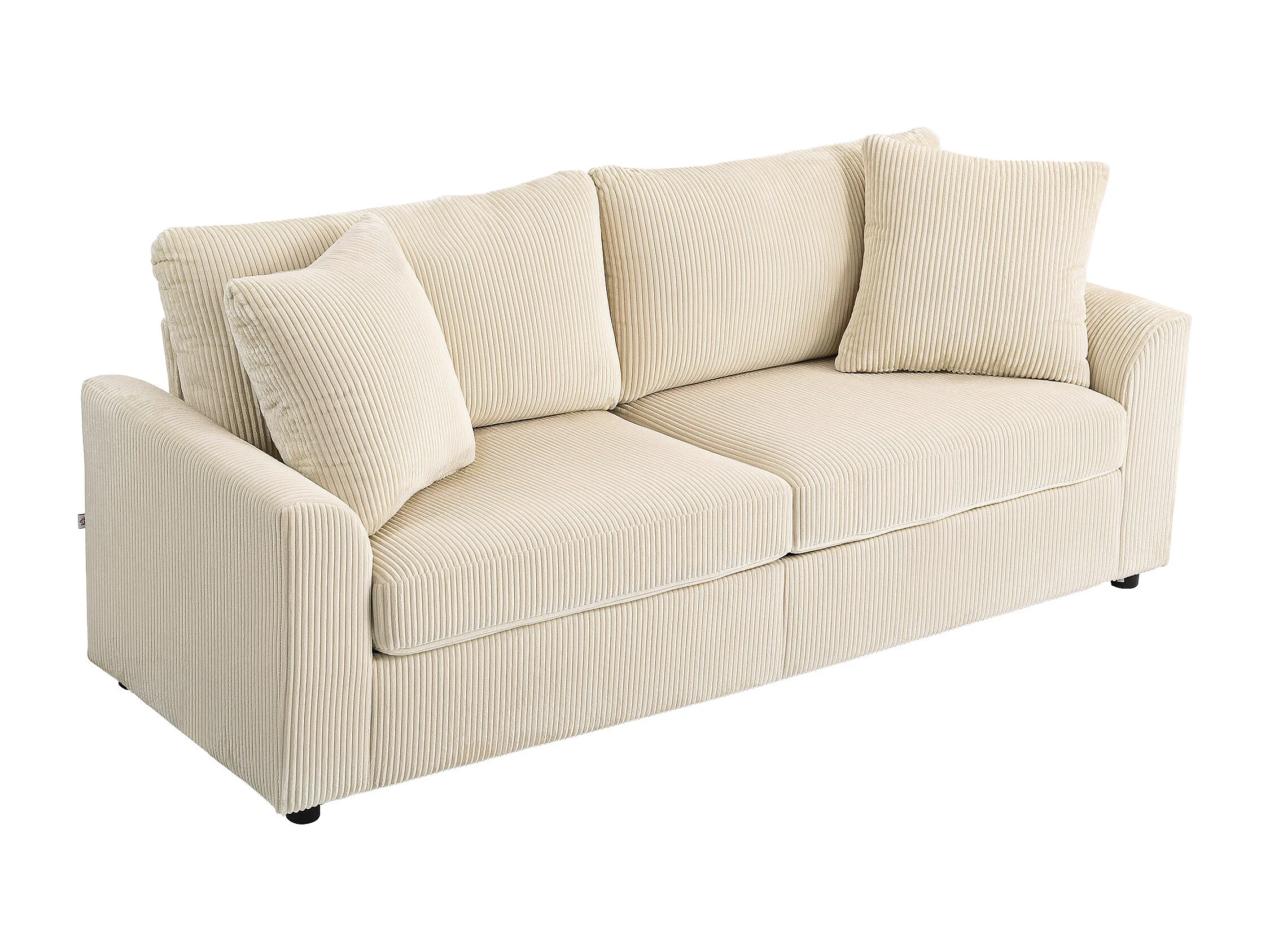 Canapé 3 places velours côtelé avec 2 coussins - canapé droit fixe 3 places beige clair