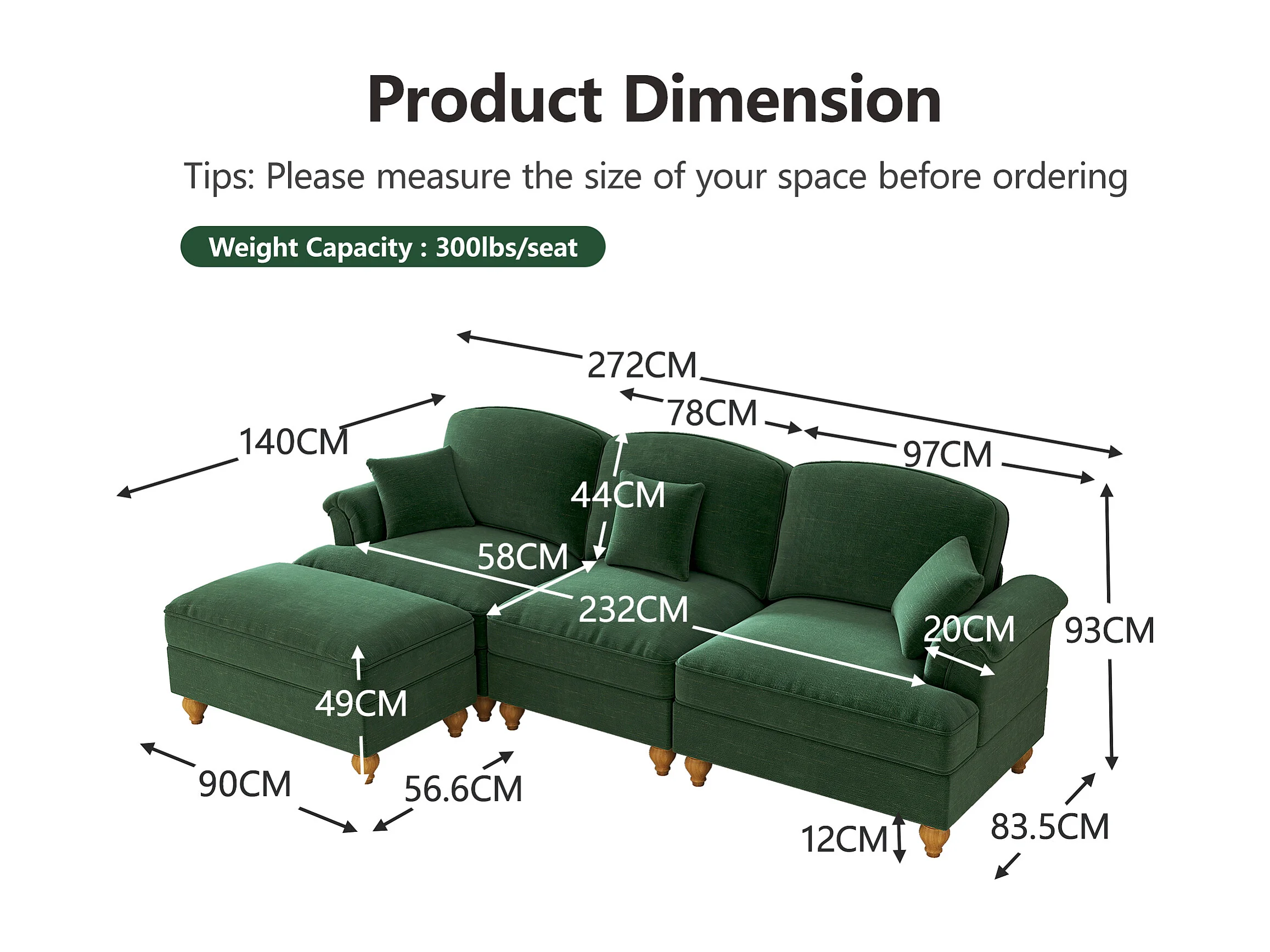Canapé 3 places vert avec soutien lombaire - Repose-pieds mobile - Tissu chenille