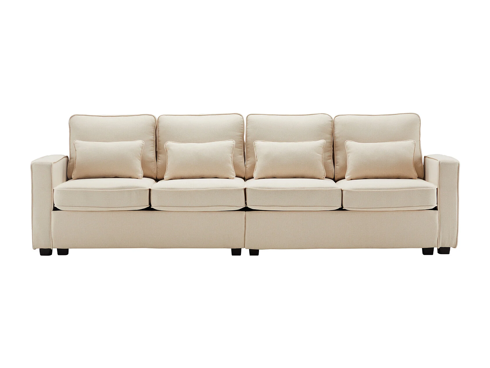 Canapé 4 places, 264x83x87cm, tissu lin, avec poches d'accoudoir et 4 coussins, style simple, pour le salon, beige