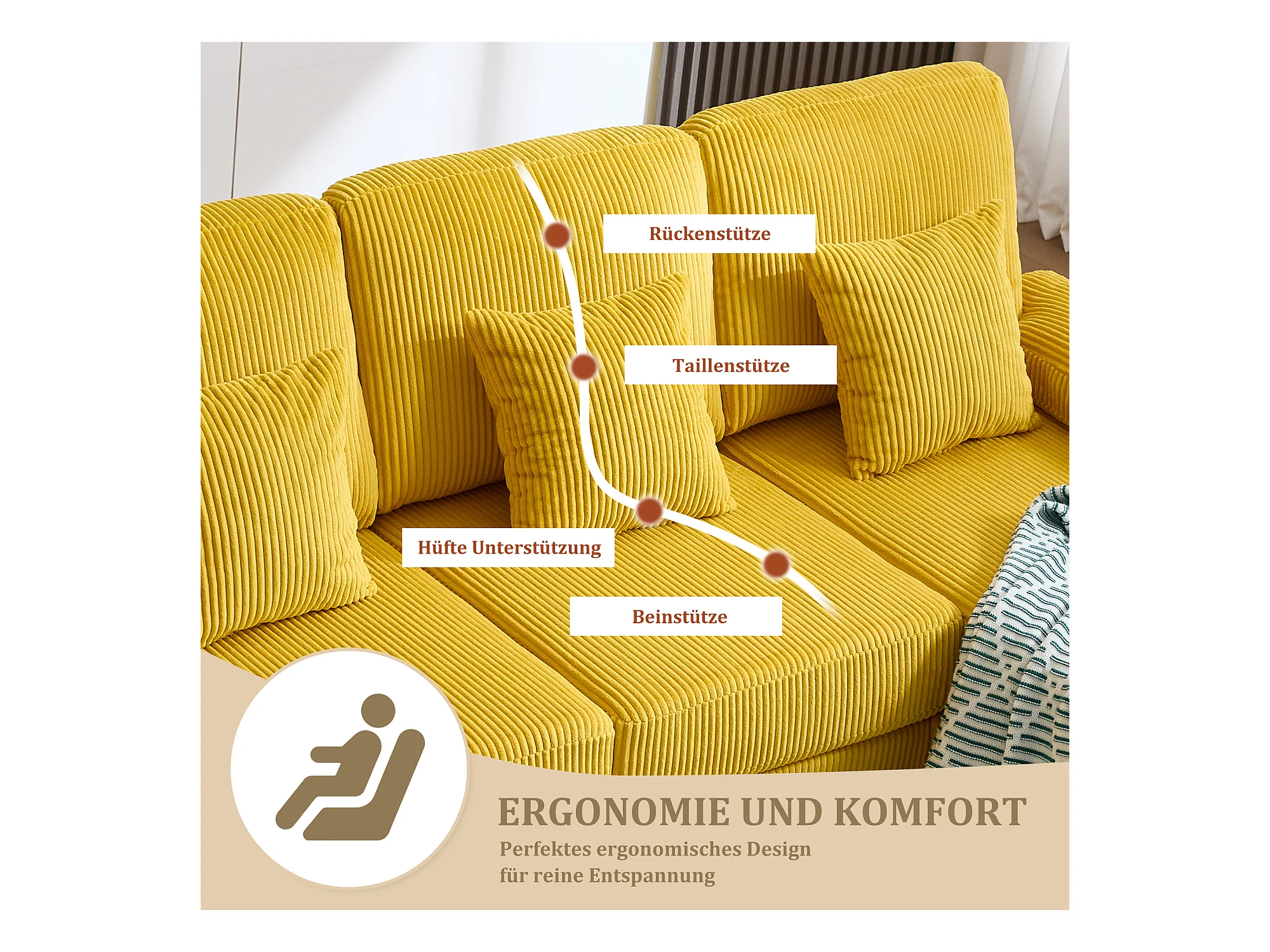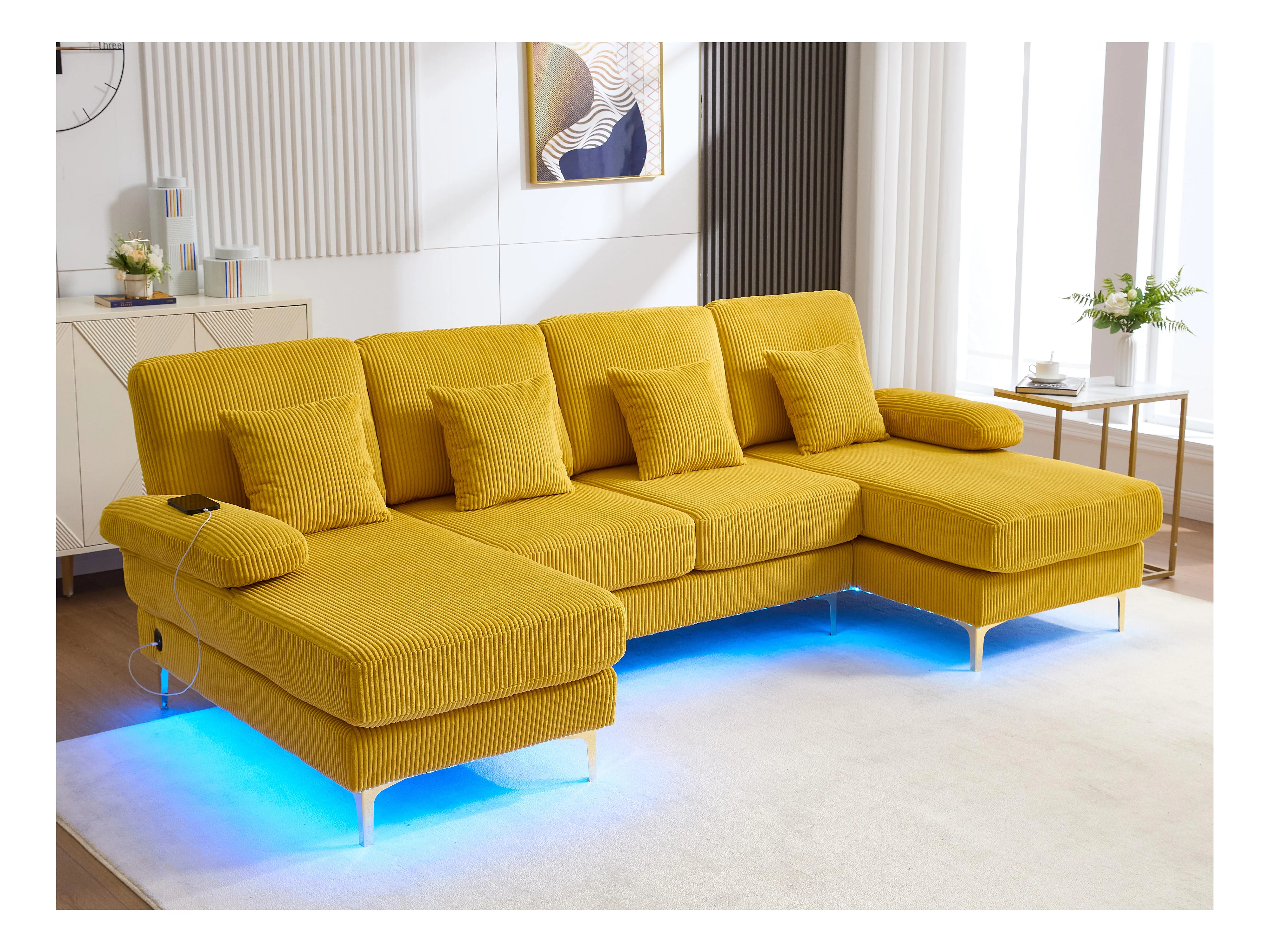 Canapé 4 places - Canapé d'angle modulable en velours jaune - Coussins amovibles double épaisseur - LED intégré et port USB - confort ergonomique et soutien optimal