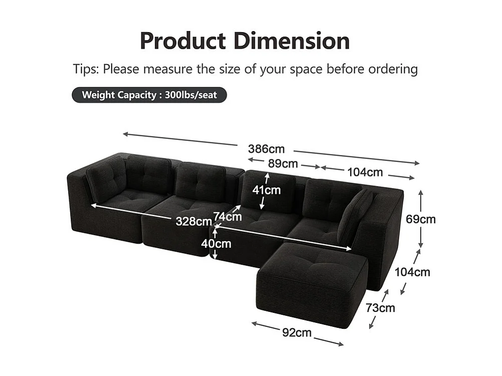 Canapé 4 places d'angle en velours côtelé, avec pouf et 6 coussins, 386x177x69cm, Noir