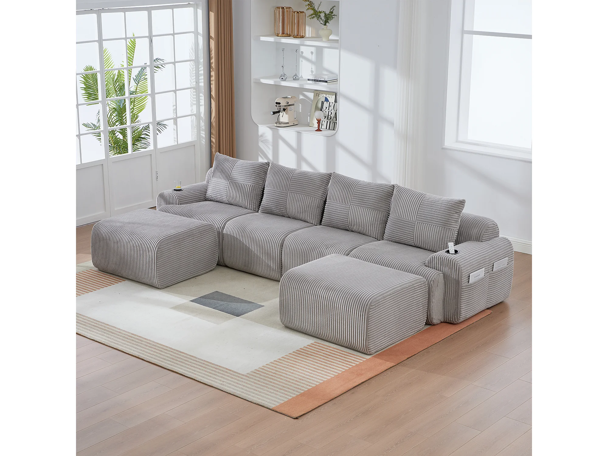 Canapé 4 places d'angle modulable en Velours côtelé, avec 2 pouf et 4 coussins, 333x174x80cm, Gris clair