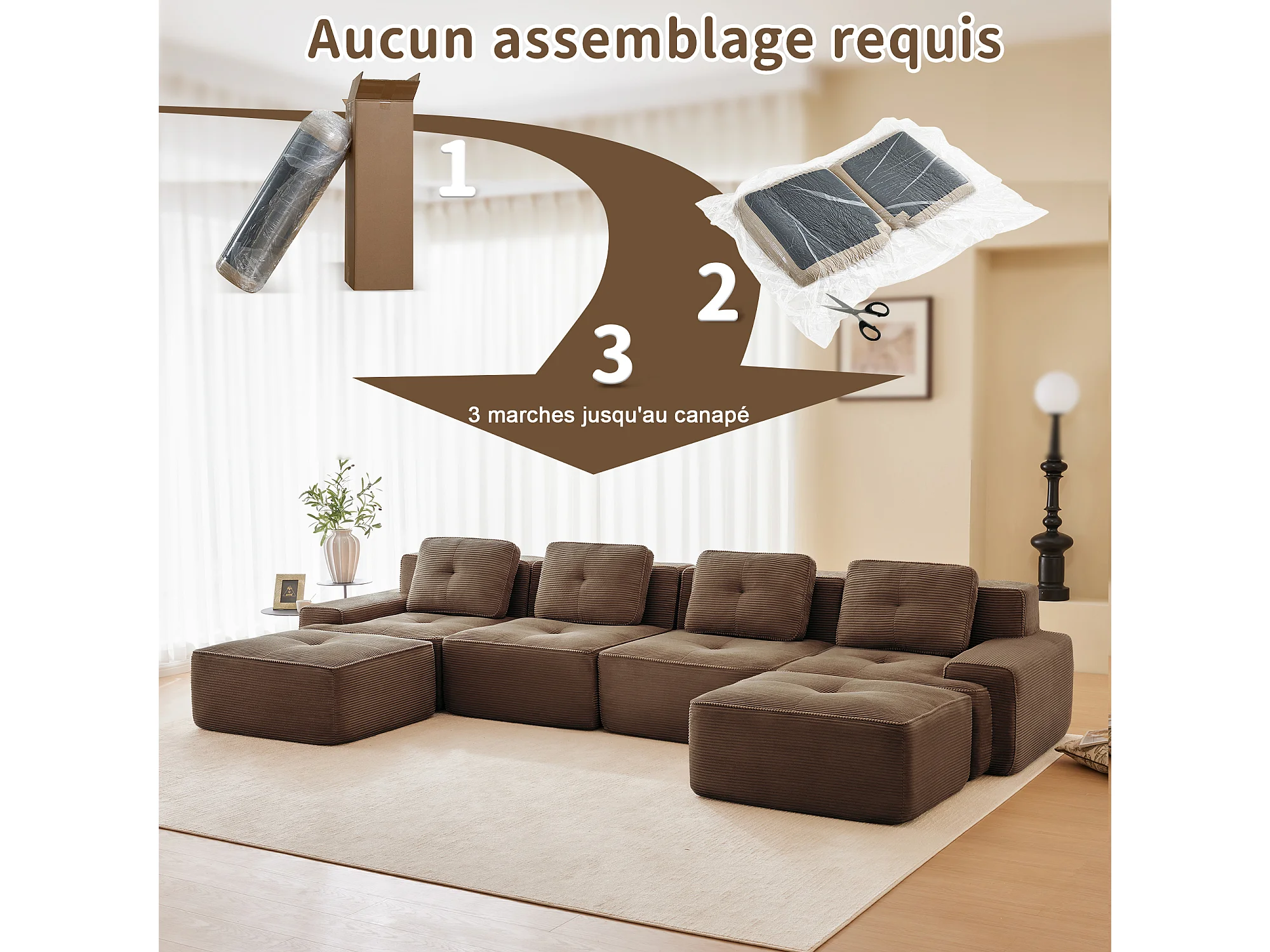 Canapé 4 places d'angle Modulable en Velours côtelé, avec 2 pouf et 4 coussins, 382x177x69cm, Marron