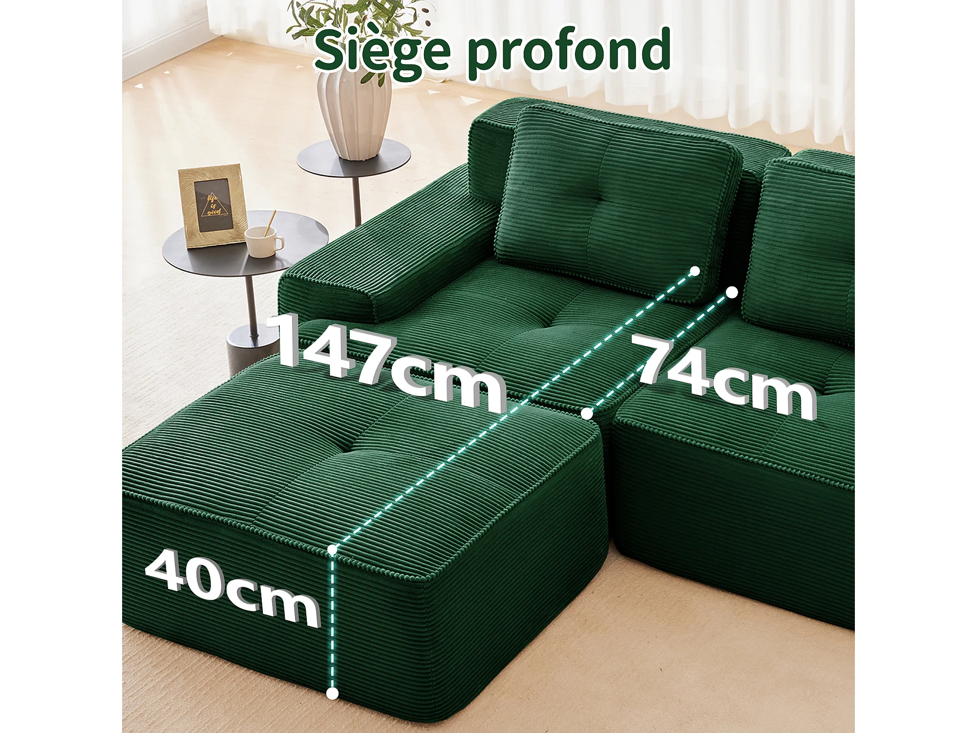 Canapé 4 places d'angle Modulable en Velours côtelé, avec 2 pouf et 4 coussins, 382x177x69cm, Vert