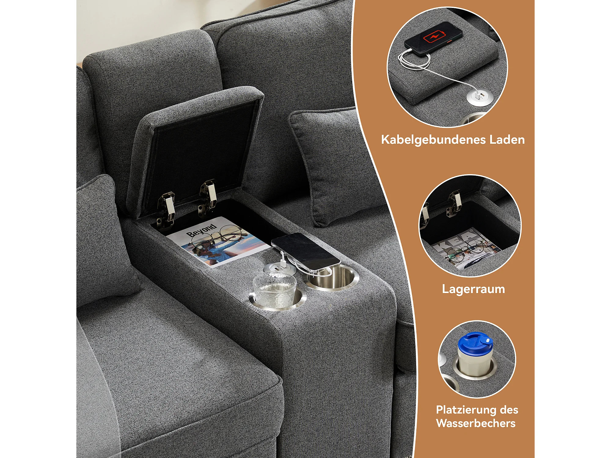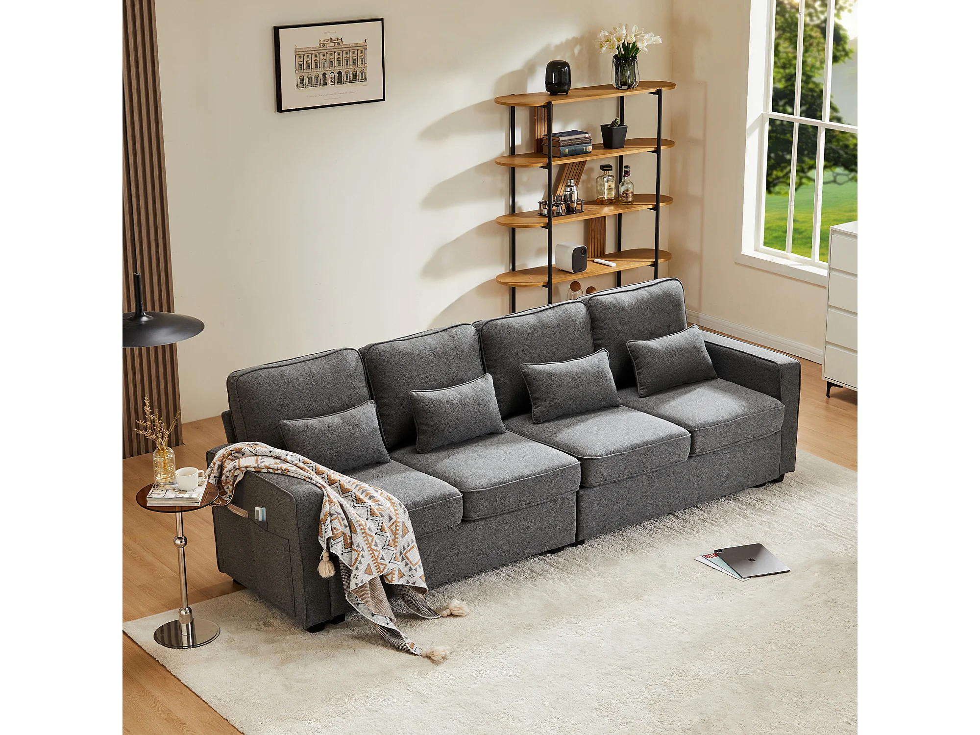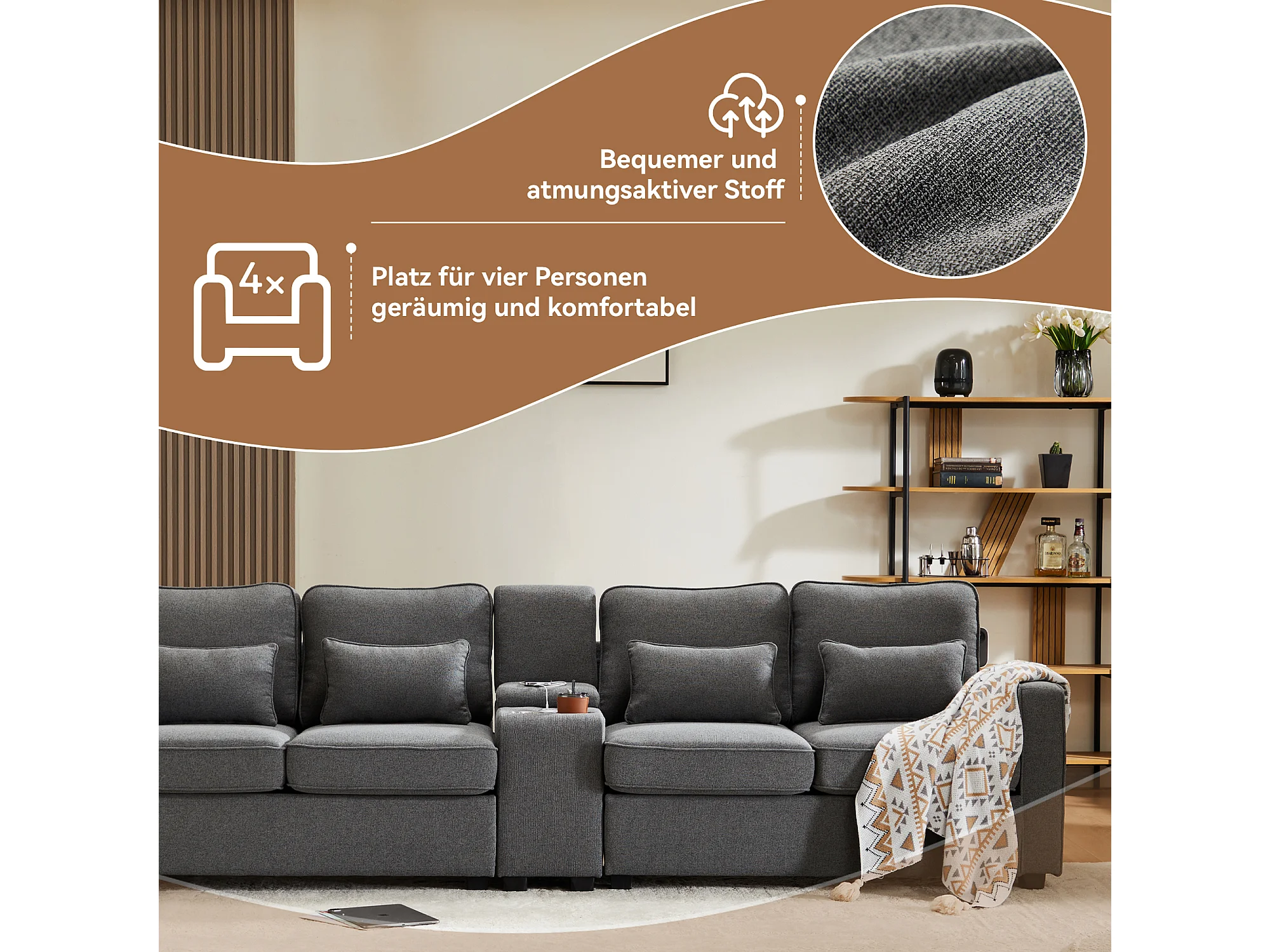 Canapé 4 places en lin avec console, 2 porte-gobelets, 2 ports USB, poches accoudoirs et 4 coussins, style simple pour salon ou appartement