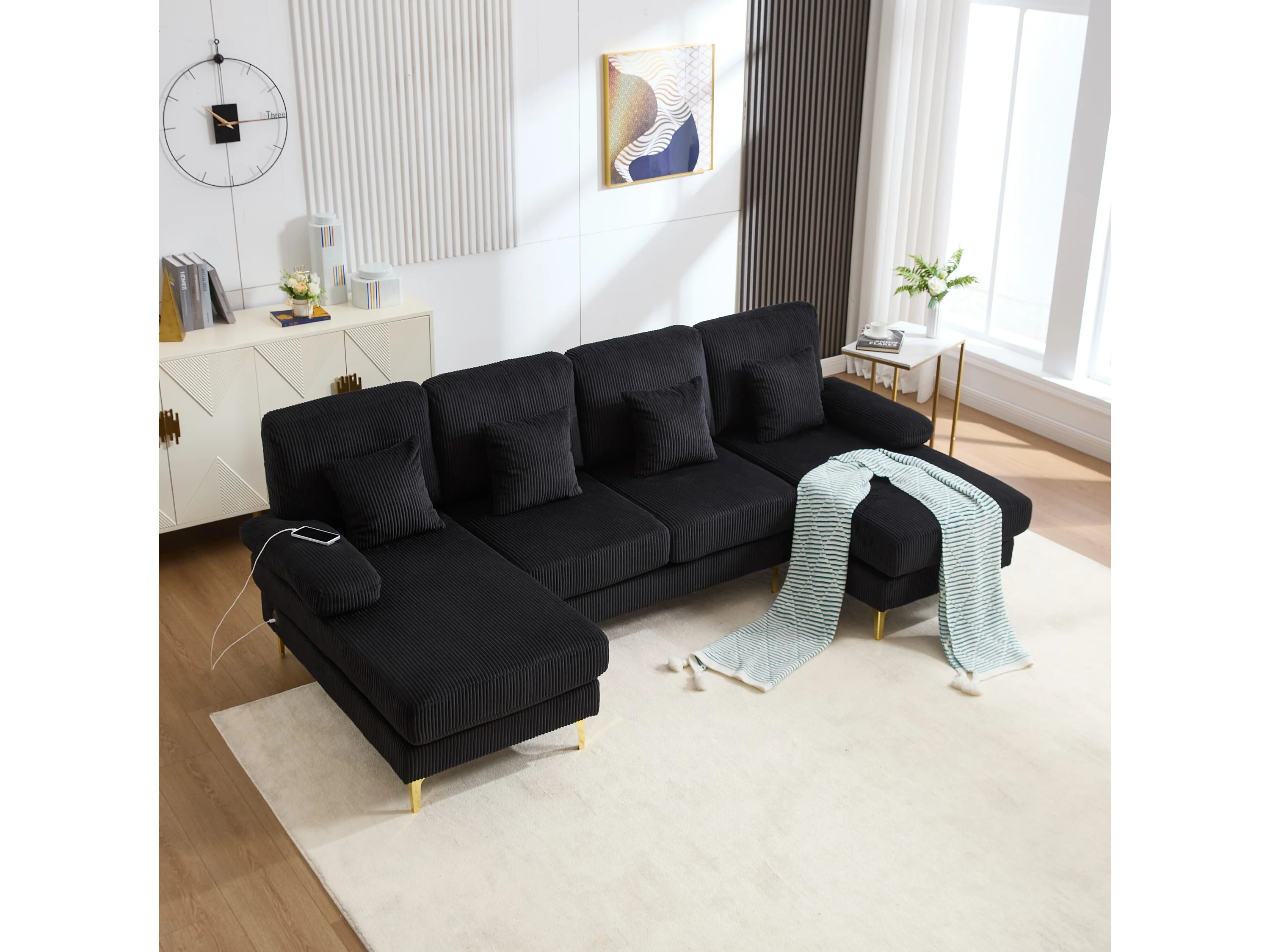 Canapé 4 places en velours noir avec éclairage LED et ports USB - Design moderne en U